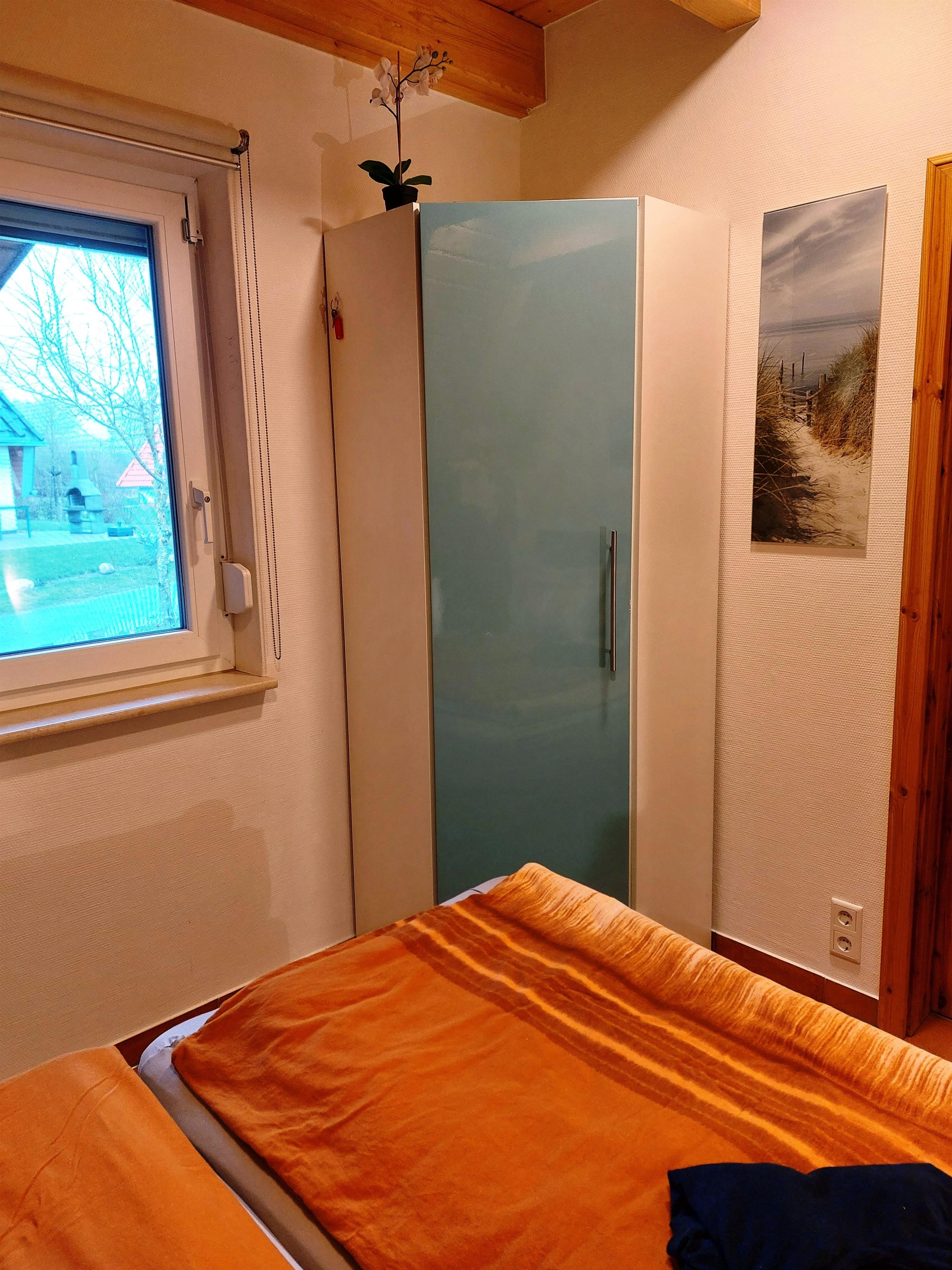 Aufgeteilt im Erdgeschoss mit einem Wohn-/Küchen-/Esszimmer mit Kamin, ein Duschbad mit bodengleicher Dusche und ein Schlafzimmer mit Doppelbett (160 x 200 cm mit 2 Eintelmatratzen ). Die Fenster sind mit Rollläden zur 100% Verdunkelung und Insektenschutz ausgestattet. Für den Kamin ist Kaminholz mitzubringen und der Kamin ist bei Abreise gereinigt zu hinterlassen