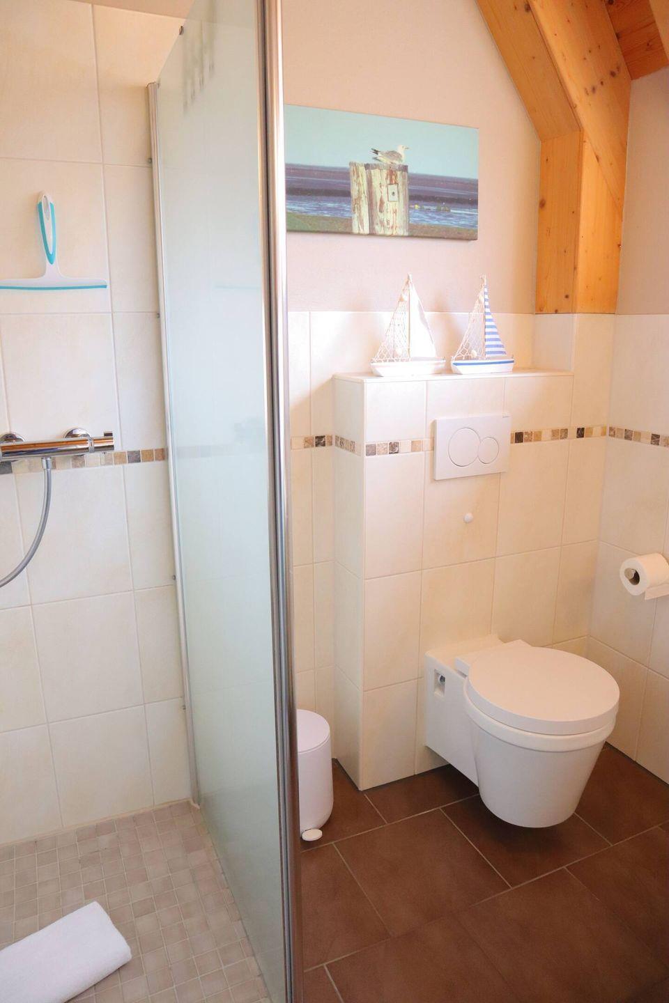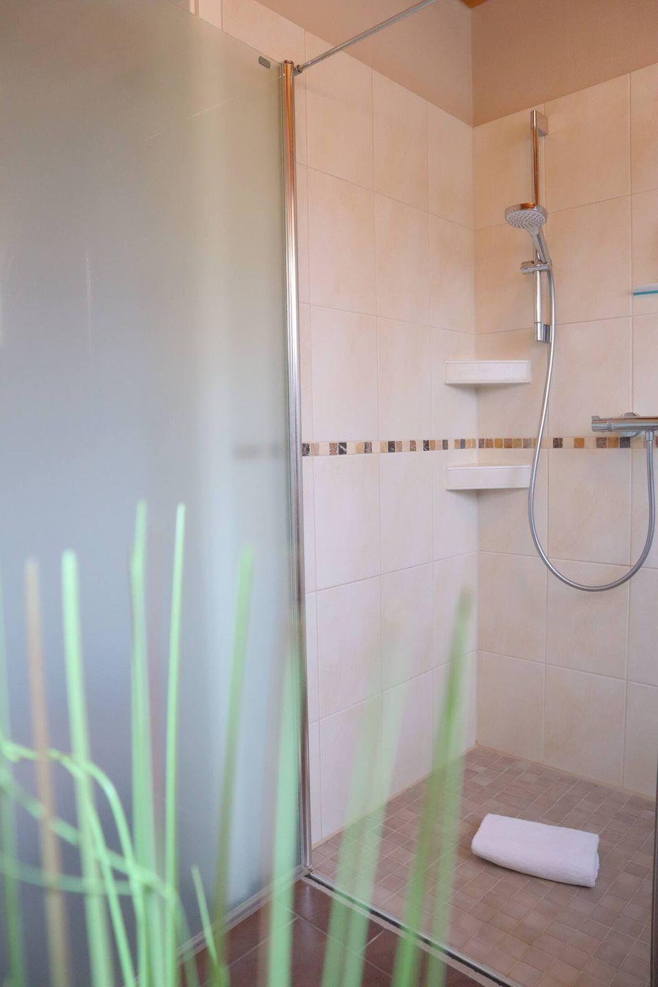 Im Badezimmer erwartet Sie eine moderne, ebenerdige Dusche, während ein zusätzliches kleines Bad im Obergeschoss für mehr Komfort sorgt.
