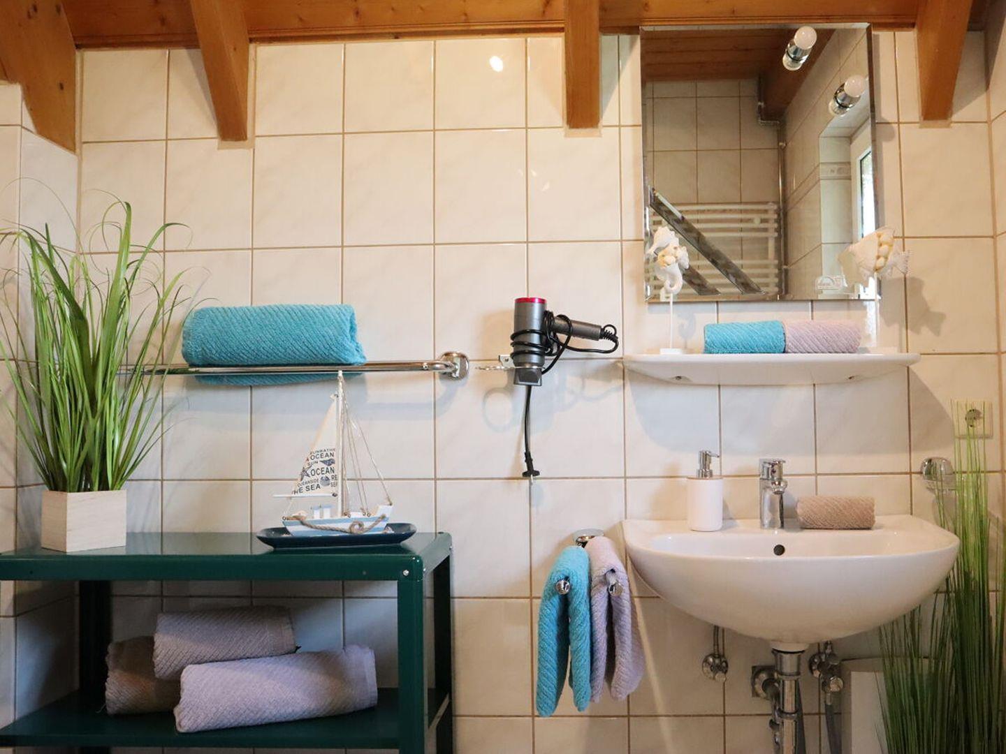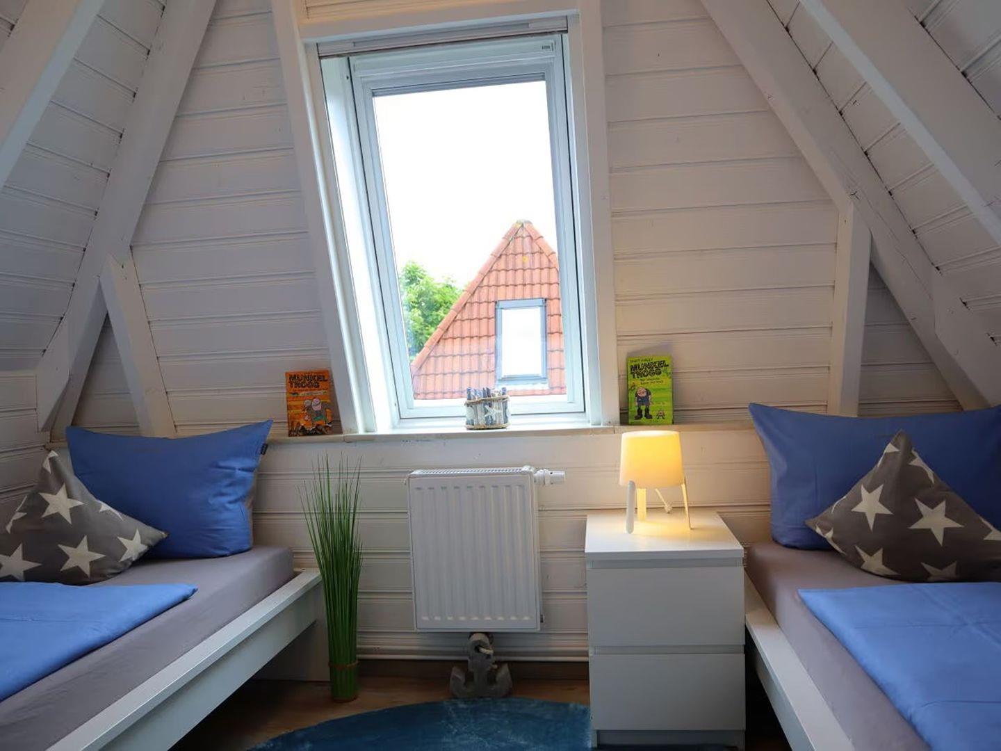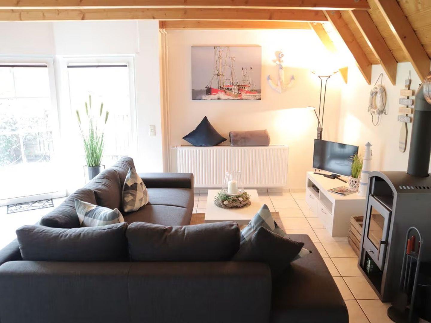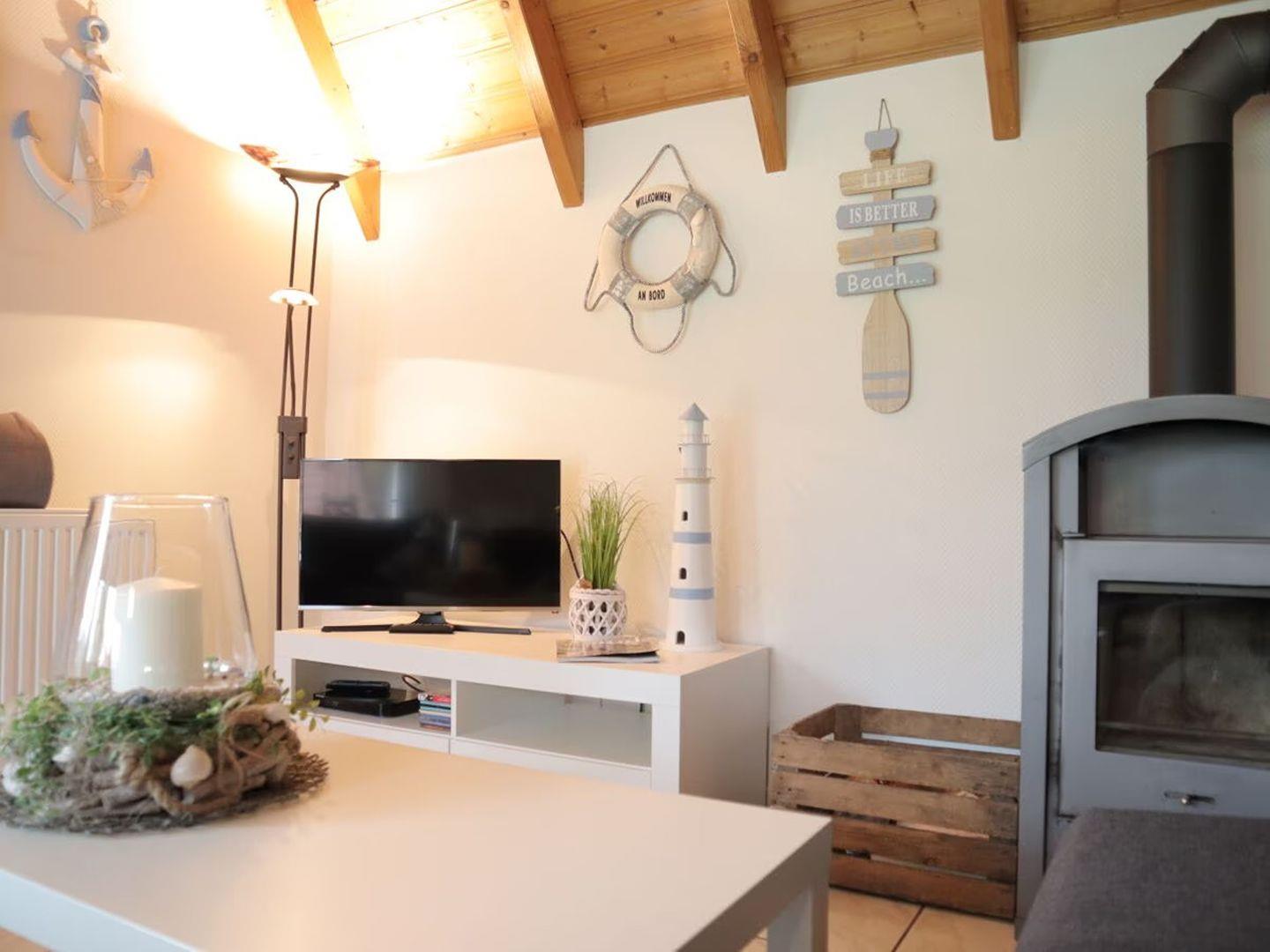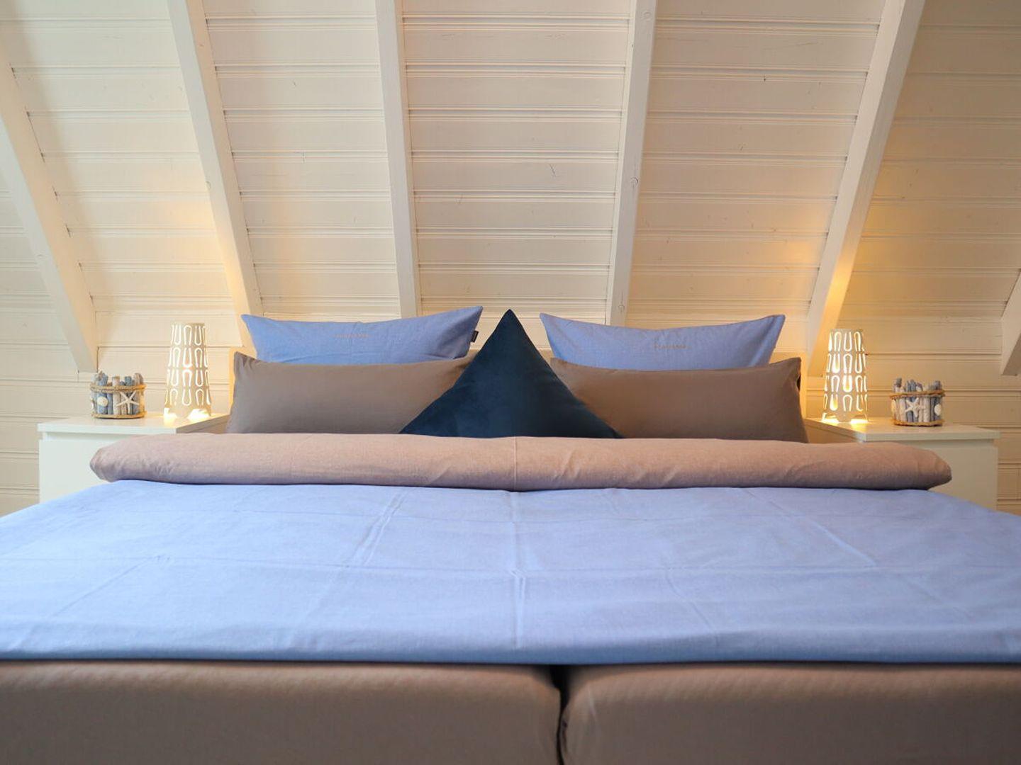 Im Obergeschoss finden Sie zwei einladende Schlafzimmer, die mit nordischem Charme und Komfort gestaltet sind und Platz für bis zu 4 Personen bieten. Die gemütliche Sofaecke mit einem Fernseher und einem einladenden Kaminofen lädt zu entspannten Stunden ein, sei es beim Lesen eines Buches oder beim gemeinsamen Spielen.