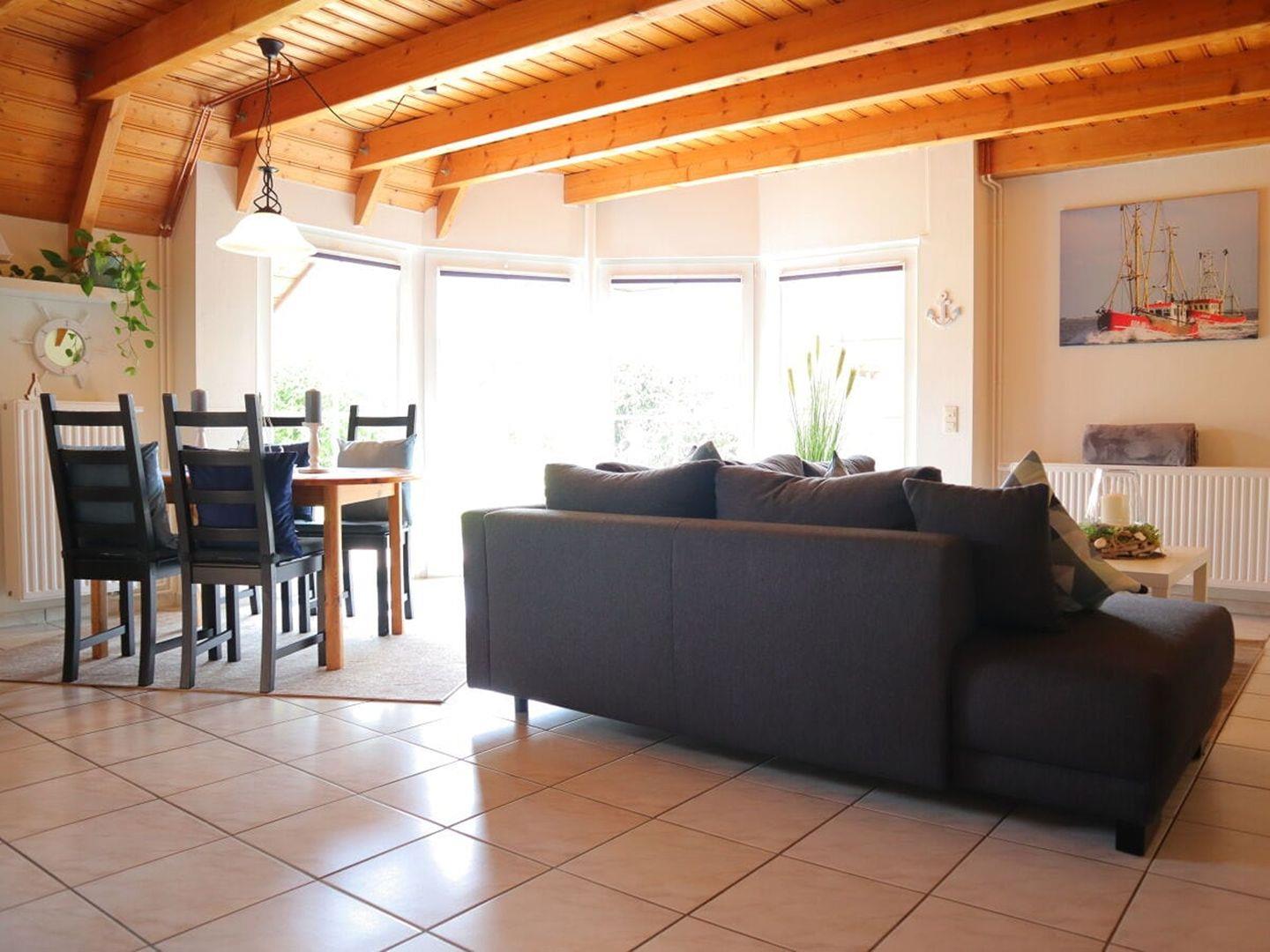 Willkommen im Ferienhaus Poseidon, wo nordischer Stil und moderne Eleganz aufeinandertreffen, um Ihnen einen unvergesslichen Nordseeurlaub zu bieten. Das geräumige und offen gestaltete Wohn- und Esszimmer ist der perfekte Ort, um die entspannte Urlaubsatmosphäre zu genießen. Große Fenster lassen viel Tageslicht herein und bieten einen Blick auf die angrenzende Terrasse, wo moderne Gartenmöbel und ein Grill zu gemütlichen Abenden im Freien einladen.
