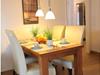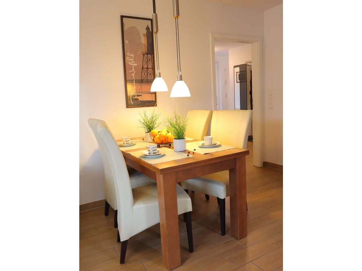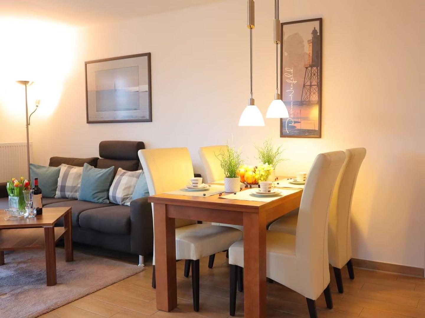 Der Wohn- und Essbereich ist offen gestaltet und lädt zum Verweilen ein. Die vollausgestattete Küche ermöglicht die Zubereitung köstlicher Mahlzeiten, die dann gemeinsam am Esstisch genossen werden können. Vom Wohnzimmer aus gelangen Sie auf den sonnigen Balkon mit Windschutz, der einen herrlichen Blick auf den grünen Deich und spektakuläre Sonnenuntergänge bietet.