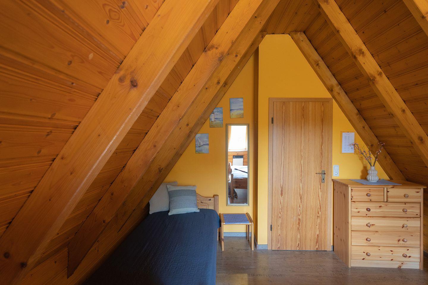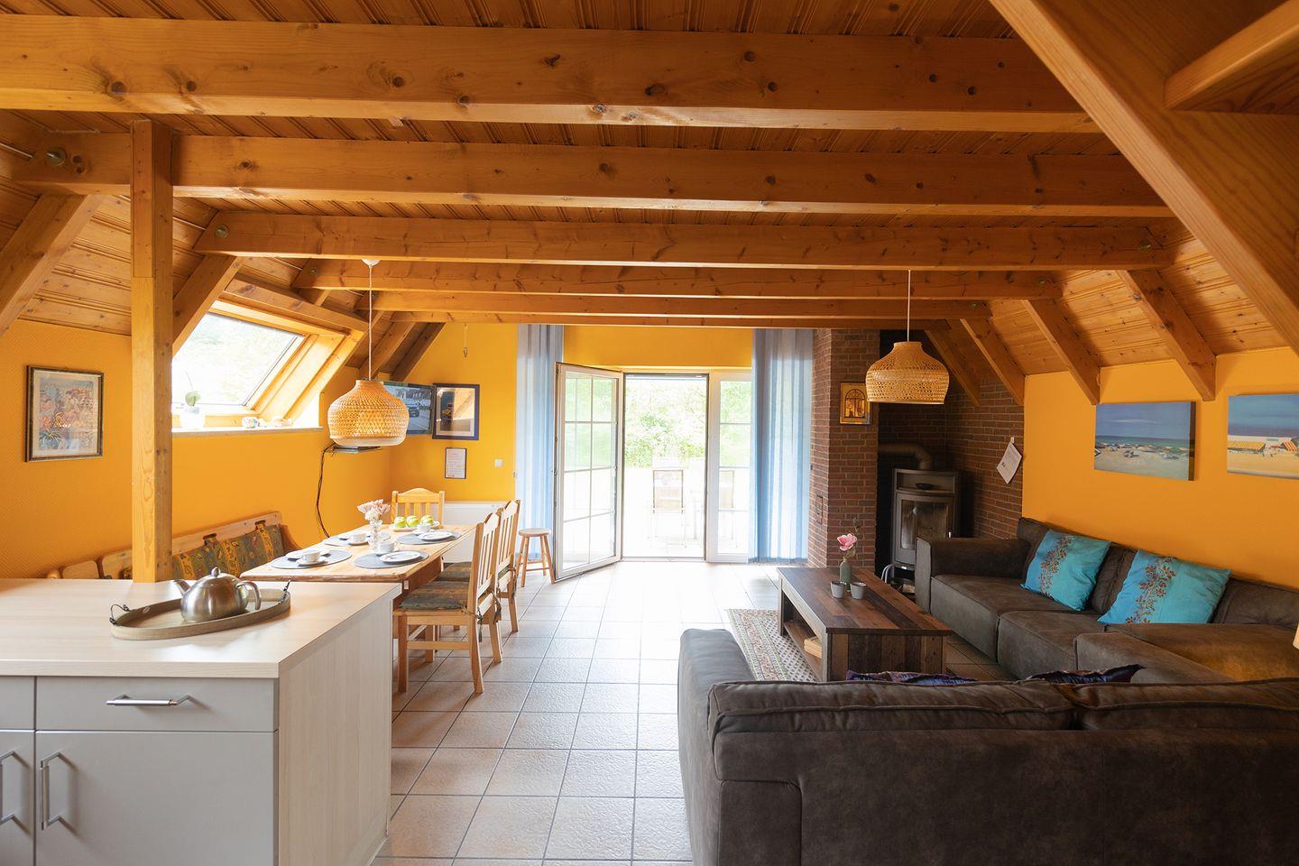Nur wenige Gehminuten vom Deich entfernt liegt dieses strandnahe Ferienhaus für Familien an der Nordsee. Auf 65 m² bietet es zwei Schlafzimmer, ein helles Wohnzimmer mit Kaminofen und eine offene Küche mit Esstisch – ideal für entspannte Familienzeit nach einem Tag am Meer. WLAN ist vorhanden. Im Erdgeschoss befinden sich das Duschbad mit Waschmaschine sowie das erste Schlafzimmer mit zwei Einzelbetten, im Obergeschoss liegt das Elternschlafzimmer mit Doppelbett.