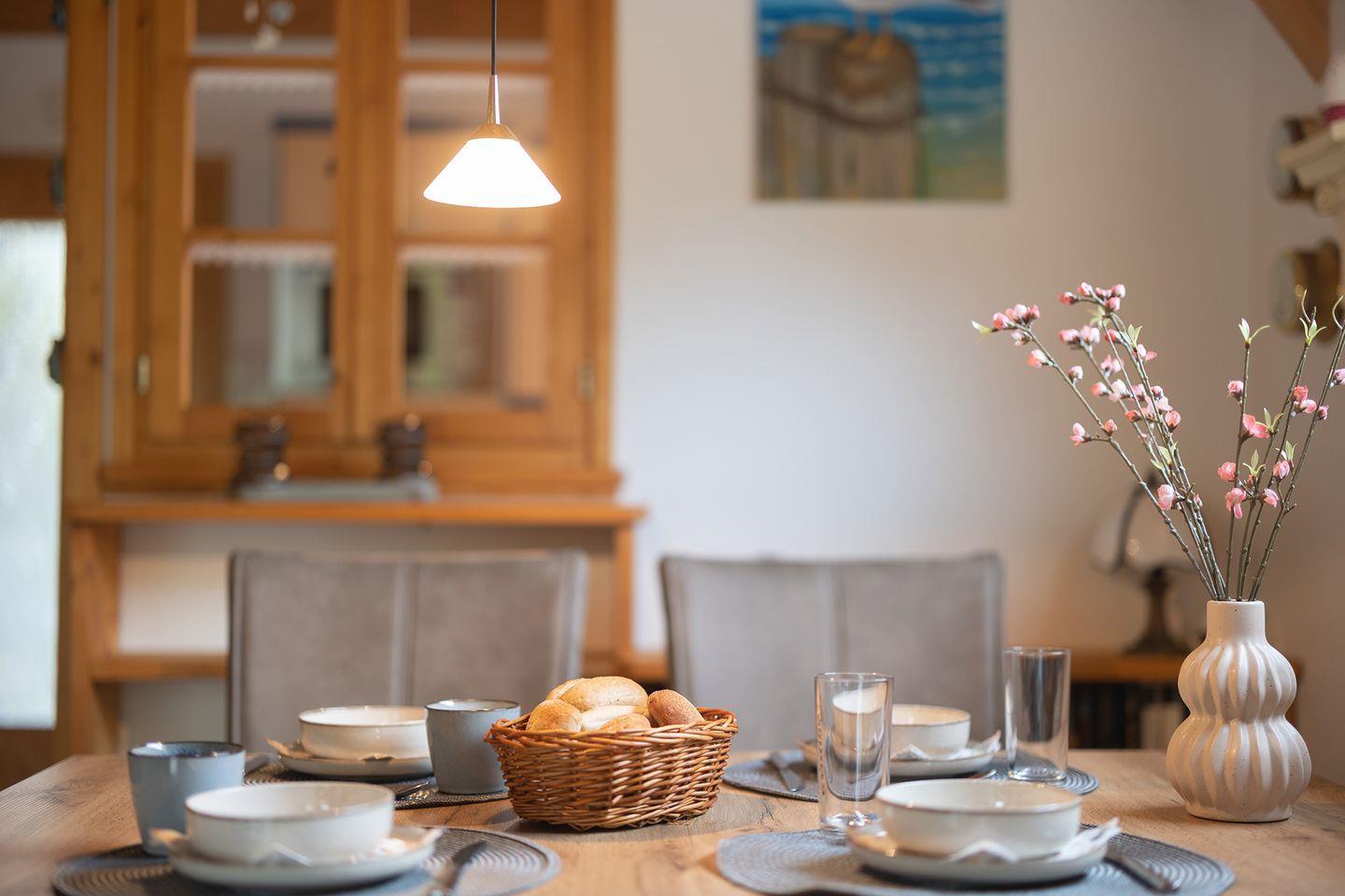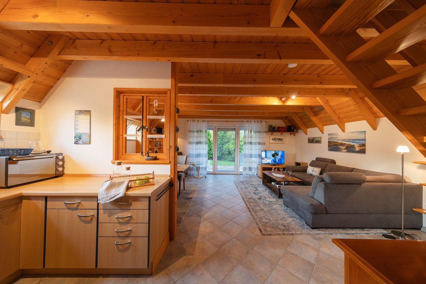 Im Wohnzimmer mit Vinylboden lädt die Sofaecke zum Ausruhen ein, während Kinder Spiele entdecken oder TV und WLAN nutzen. Die offene Küche ist komplett ausgestattet, vom Ceranfeld bis zum Gefrierfach. Zwei Schlafzimmer mit Vinylboden, ein Babybett, Hochstuhl und Steckdosensicherungen machen das Haus familienfreundlich. Im Bad findet ihr Dusche, Wanne, Spiegel und Kosmetikspiegel, dazu gibt’s ein Gäste-WC im Erdgeschoss.