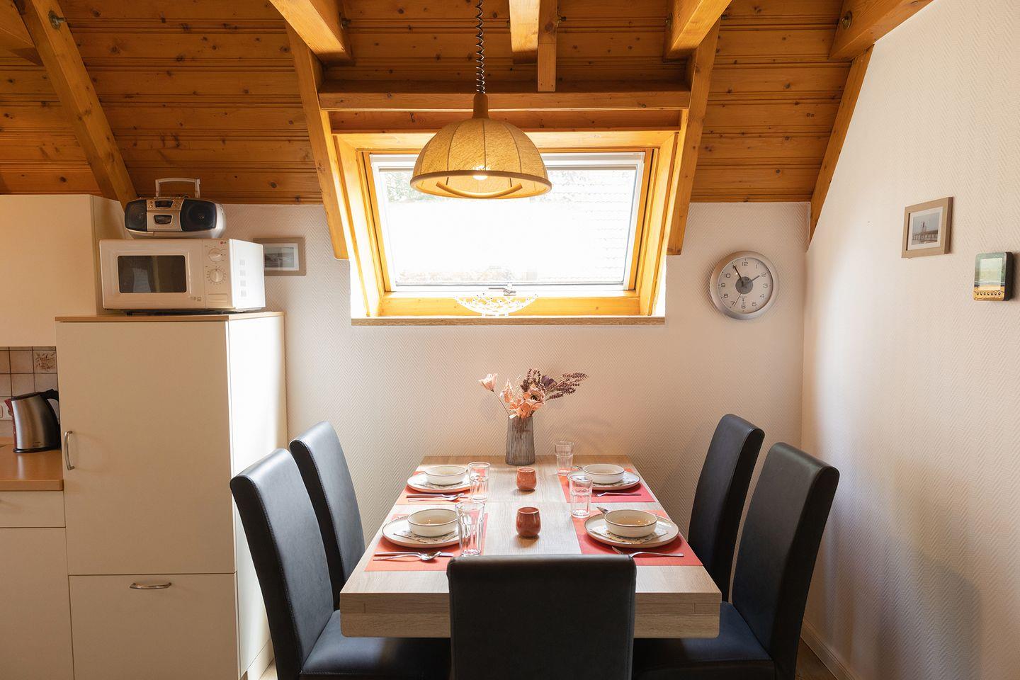 Zwei Schlafzimmer mit Laminat, ein heller Wohnbereich mit Sofaecke, Kabel-TV und Spielen – ideal für entspannte Abende. Die offene Küche ist vollständig ausgestattet, von Ceranfeld über Spülmaschine bis zum Eierkocher. Im Duschbad gibt es eine Waschmaschine, dazu ein Gäste-WC. Kinderbett, Hochstuhl, Treppengitter und Steckdosensicherungen sind vorhanden.