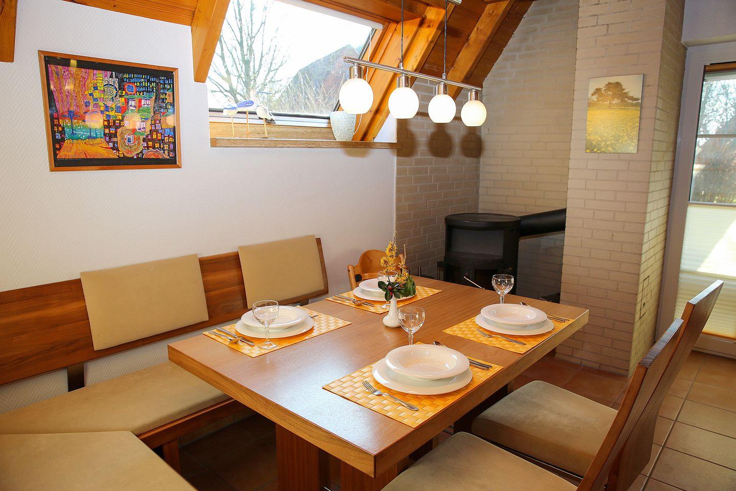 Hinterm Deich liegt das Ferienhaus „Xenia“ wie ein kleines Versteck zwischen Feldern und Nordseeluft. Auf zwei Etagen bietet es 68?m² Raum für Familienzeit: zwei Schlafzimmer, ein helles Wohnzimmer mit Kaminofen und eine komplett ausgestattete Küche inklusive Spülmaschine.