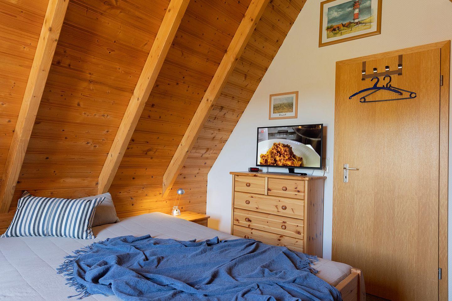 Im Obergeschoss wartet ein geräumiges Schlafzimmer mit Doppelbett, Einzelbett und Zustellbett sowie ein zweites Schlafzimmer mit zwei getrennt stehenden Betten. Kinderbett, Hochstuhl und Treppengitter sind selbstverständlich vorhanden. Die möblierte Terrasse lädt zum Spielen und Schmökern ein, der Garten bietet Platz zum Toben. Das Haus liegt in Strandnähe (1km), fußläufig erreichst du Watt’n Bad, Kutterhafen und Leuchtturm Obereversand. Parkplätze am Haus, E-Ladesäule in der Anlage.