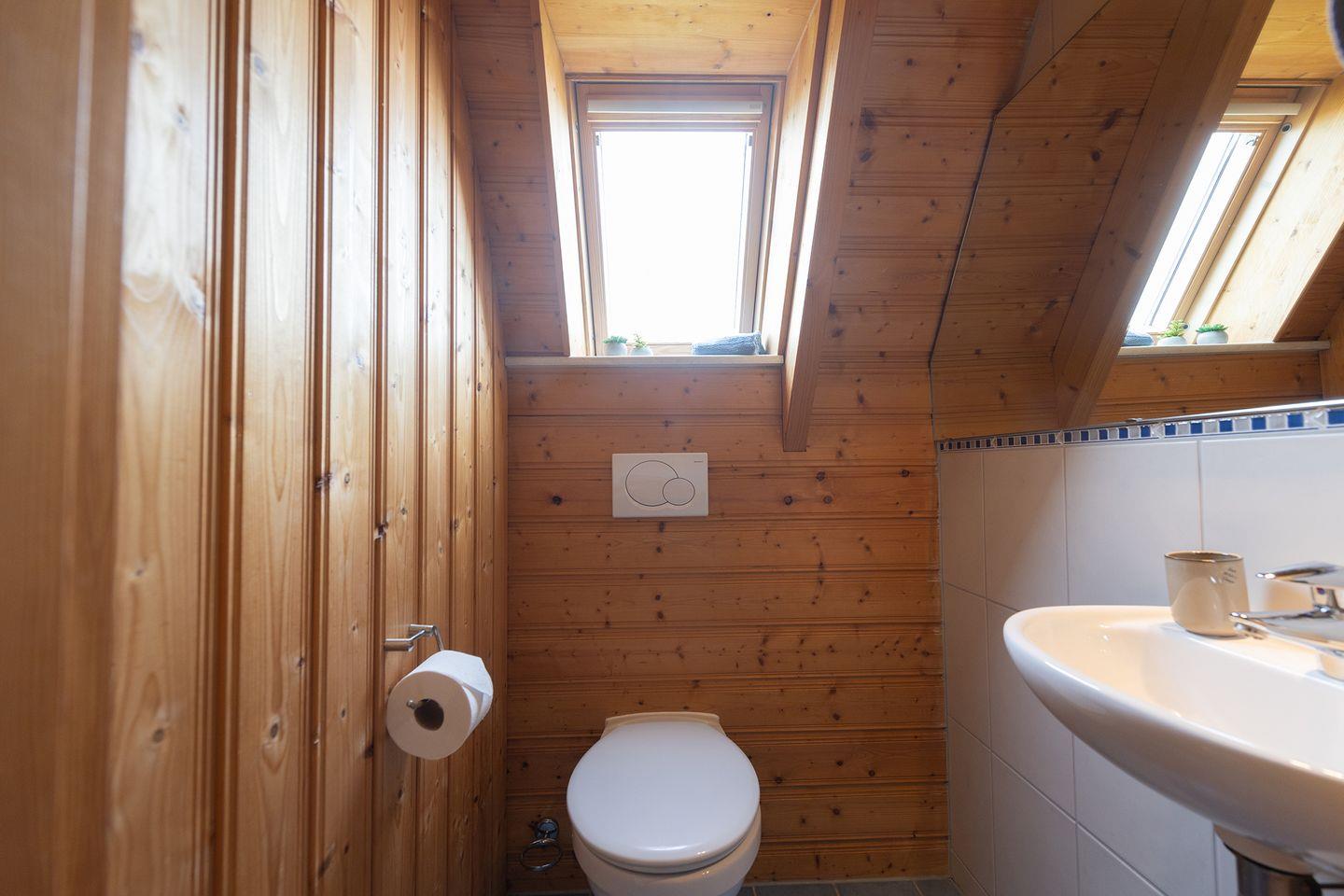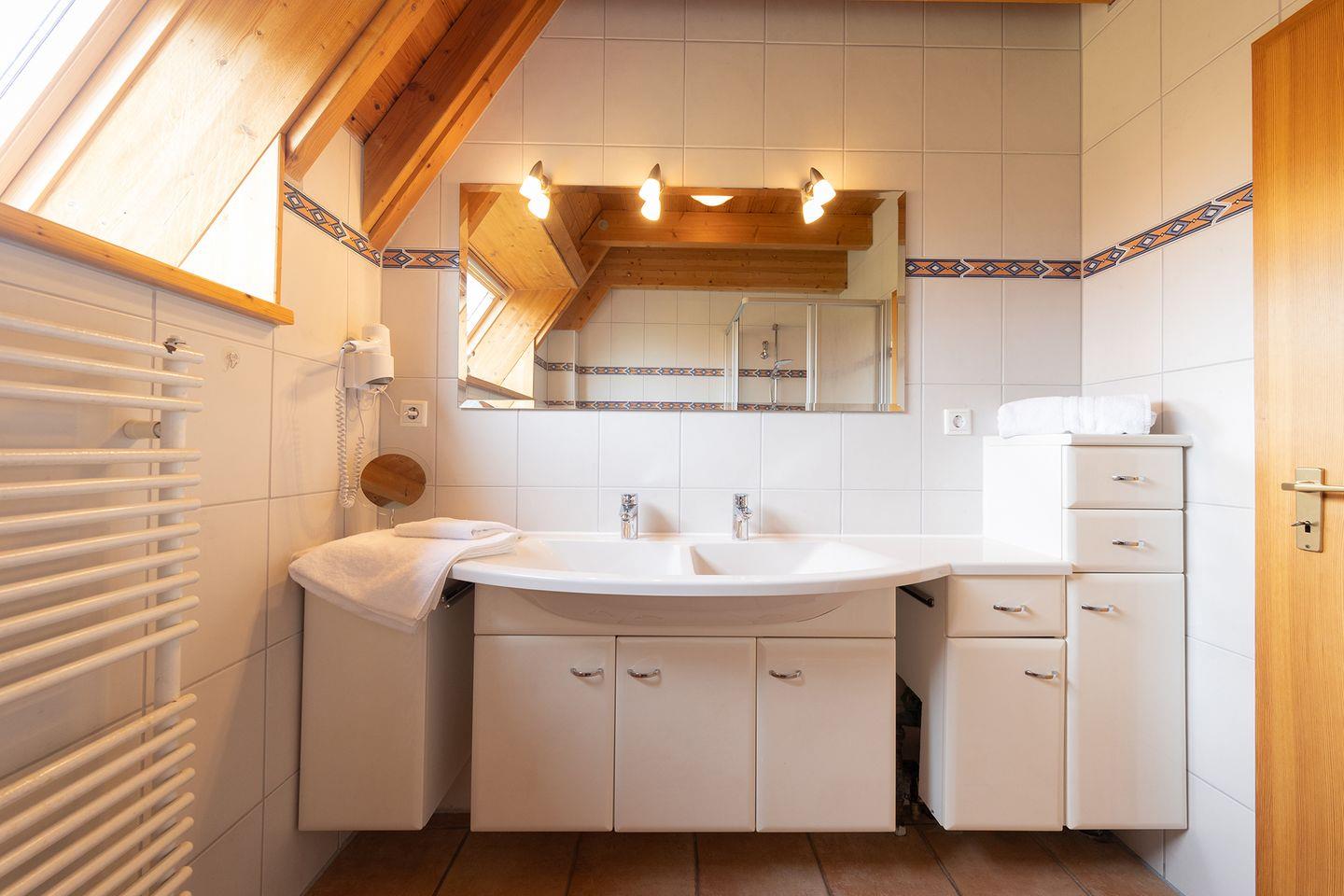 Das Bad verfügt über Dusche mit Wanne, Fenster, Kosmetikspiegel und Föhn. Zusätzlich gibt’s ein Gäste-WC. Eigene Waschmaschine, Wäscheständer, Bügeleisen und Staubsauger machen auch längere Aufenthalte unkompliziert.