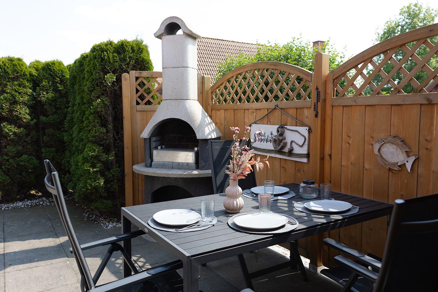 Kinderbett, Hochstuhl und Treppengitter sind vorhanden, ebenso wie Spiele, Waschmaschine und WLAN – perfekt für den Nordseeurlaub mit Kindern. Der Garten mit Terrasse, Sonnenliegen, Gartenhaus und zwei Grills lädt zum Draußensein ein. Zwei Hunde dürfen mitreisen.