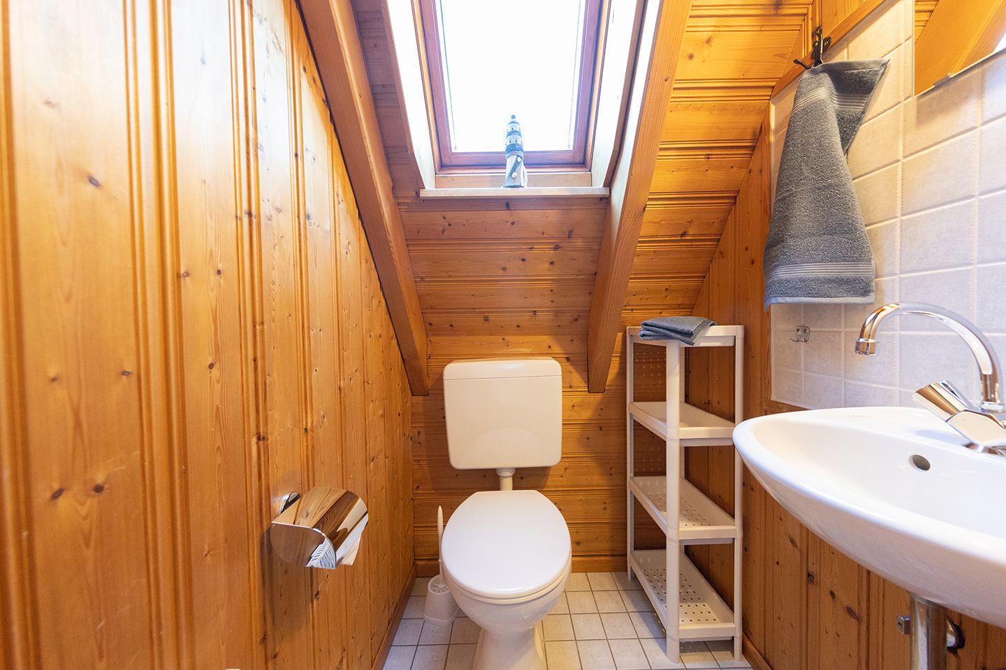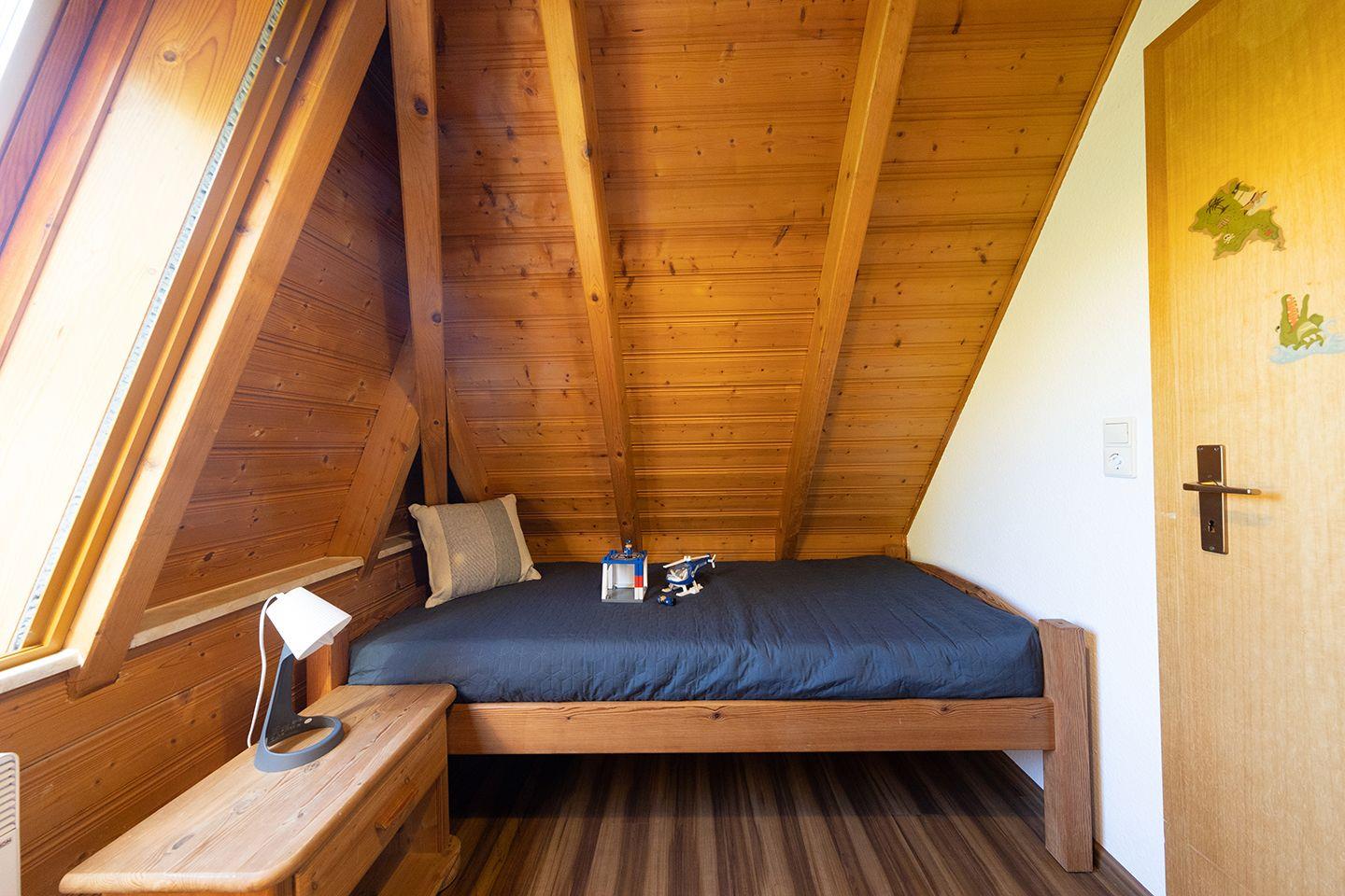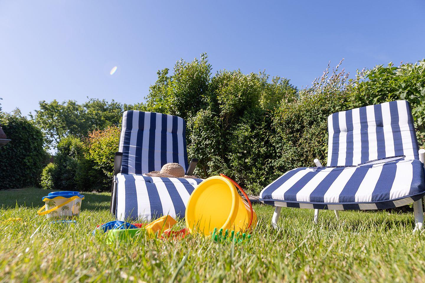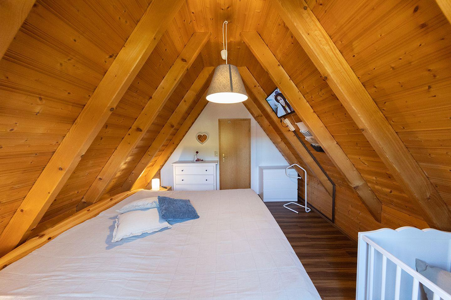 Im Obergeschoss liegen ein Elternschlafzimmer mit Doppelbett und ein separates Kinderzimmer mit zwei Einzelbetten. Beide Räume verfügen über Vinylböden, Insektenschutz und Verdunkelungsrollos. Ein zweites WC befindet sich ebenfalls oben. Kinderbett, Hochstuhl und Treppengitter sind selbstverständlich vorhanden. Draußen lädt eine möblierte Terrasse zum Verweilen ein, während der Garten genug Platz zum Spielen bietet. Das familienfreundliche Haus liegt in Strandnähe (1km) – Watt’n Bad, Leuchtturm und Kutterhafen sind zu Fuß erreichbar. Kostenfreie Parkplätze in unmittelbarer Nähe, E-Ladesäule in der Anlage.