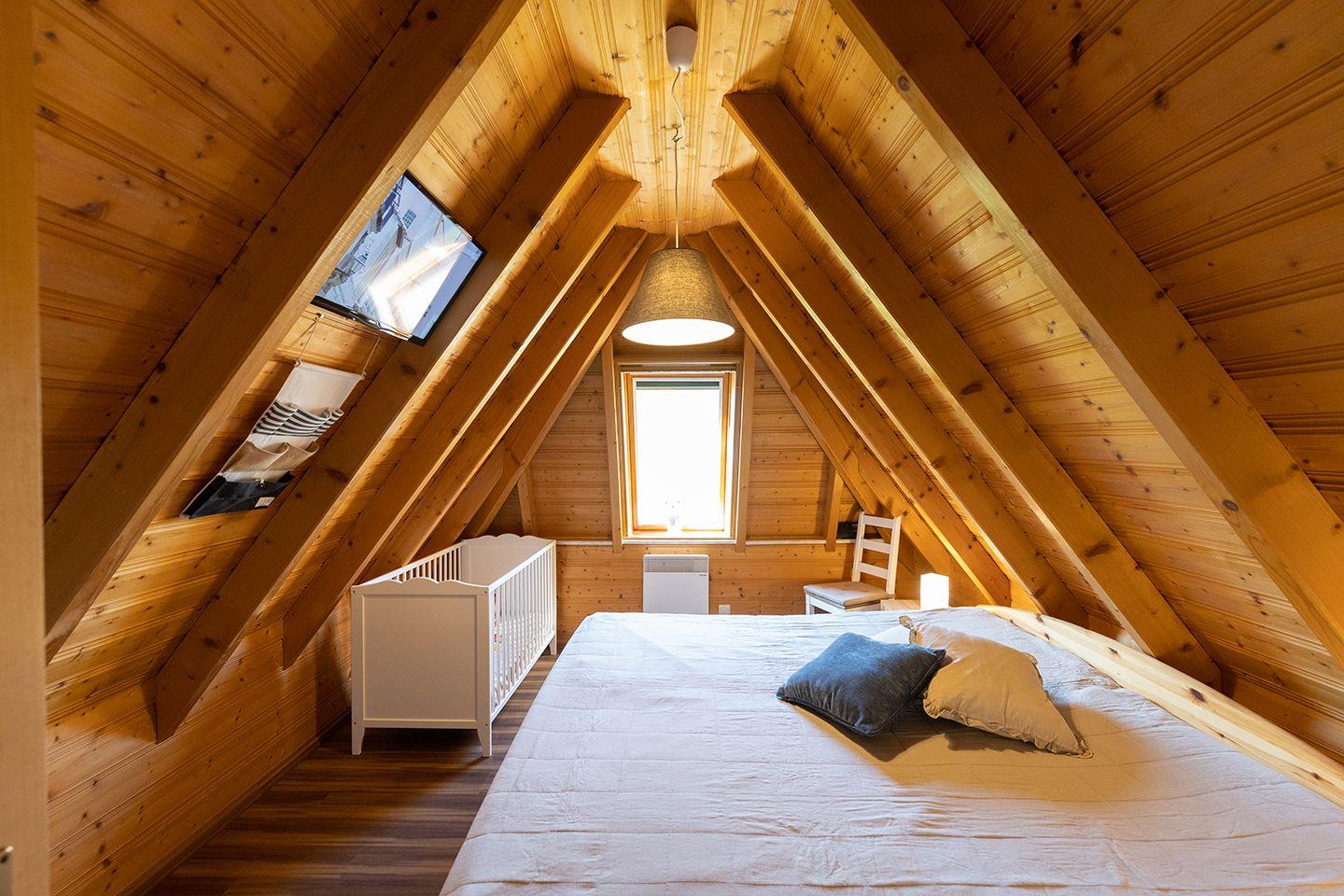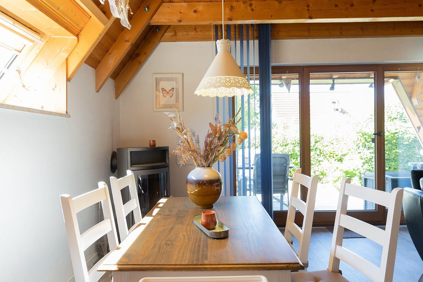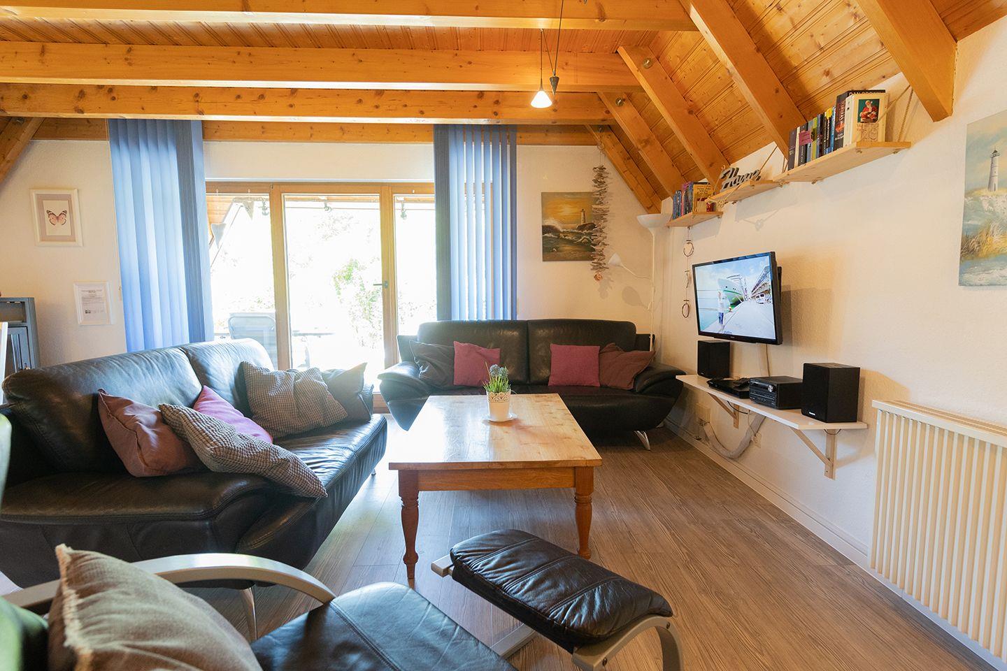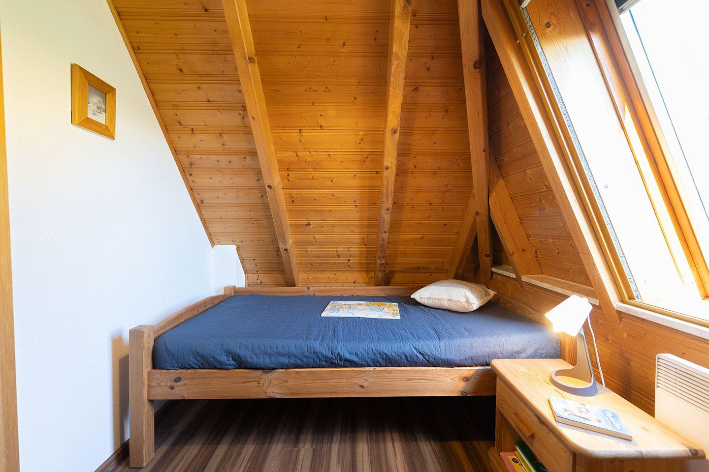 Im Obergeschoss liegen ein Elternschlafzimmer mit Doppelbett und ein separates Kinderzimmer mit zwei Einzelbetten. Beide Räume verfügen über Vinylböden, Insektenschutz und Verdunkelungsrollos. Ein zweites WC befindet sich ebenfalls oben. Kinderbett, Hochstuhl und Treppengitter sind selbstverständlich vorhanden. Draußen lädt eine möblierte Terrasse zum Verweilen ein, während der Garten genug Platz zum Spielen bietet. Das familienfreundliche Haus liegt in Strandnähe (1km) – Watt’n Bad, Leuchtturm und Kutterhafen sind zu Fuß erreichbar. Kostenfreie Parkplätze in unmittelbarer Nähe, E-Ladesäule in der Anlage.