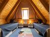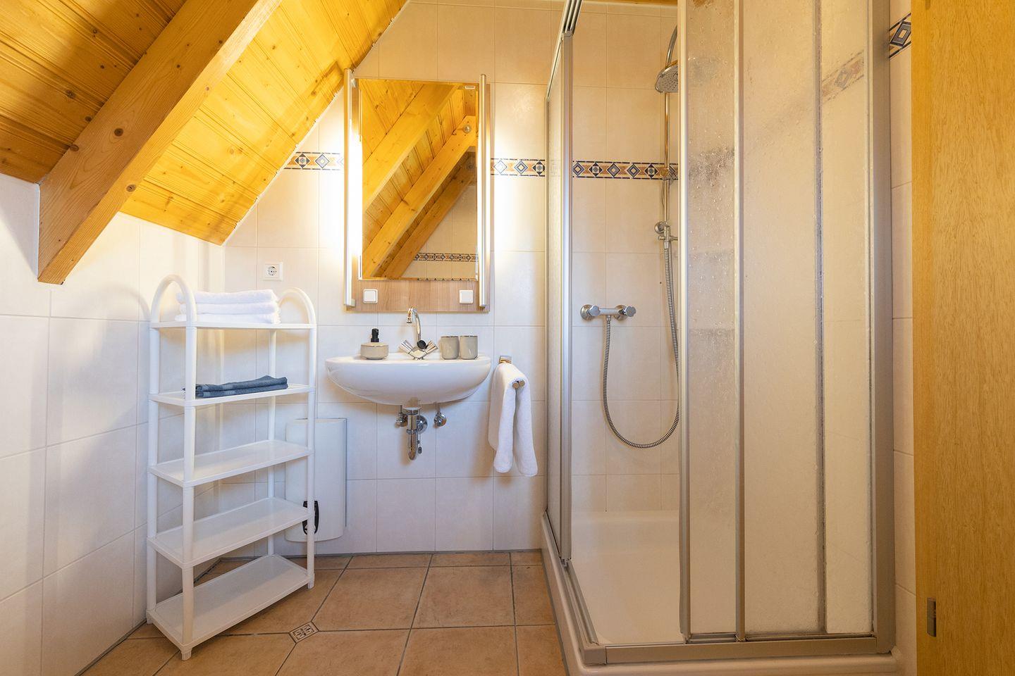Oben findet ihr das Schlafzimmer mit Doppelbett und TV sowie ein weiteres Zimmer mit zwei Einzelbetten und eigenem WC. Abdunklungsrollos sorgen für erholsamen Schlaf. Eine Ladestation für E-Autos an der Rezeption sorgt für Komfort.