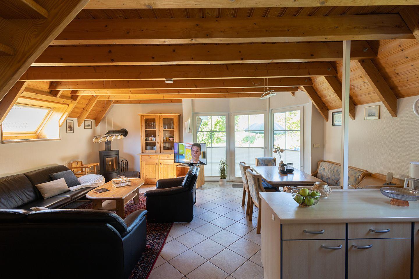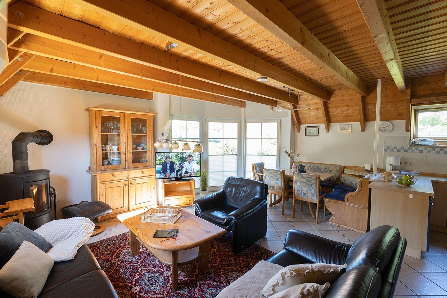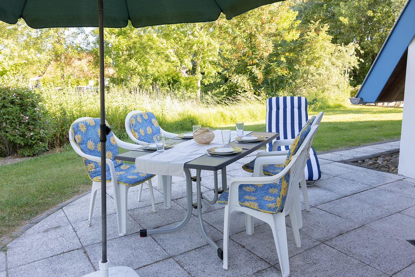 Draußen wartet eine möblierte Terrasse mit Platz für alle. Hier wird gegrillt, gespielt oder einfach nur geschaut, wie das Licht sich mit dem Tag verändert. Für Familien mit kleinen Kindern stehen Hochstuhl und Babybett bereit.