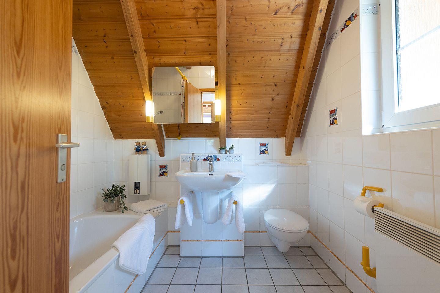 Ein Haus, das bleibt – selbst wenn die Gezeiten wechseln. In einer ruhigen Ecke von Dorum-Neufeld, umgeben von Grün, steht dieses zweigeschossige Komfortferienhaus für bis zu sechs Personen. Unten: ein helles Wohn-Esszimmer mit offener Küche, zwei Einzelbetten im Erdgeschosszimmer und ein Wannenbad für das abendliche Zur-Ruhe-Kommen. Oben: ein Elternschlafzimmer mit Doppelbett, ein Kinderschlafzimmer mit getrennten Betten und ein zusätzliches WC.