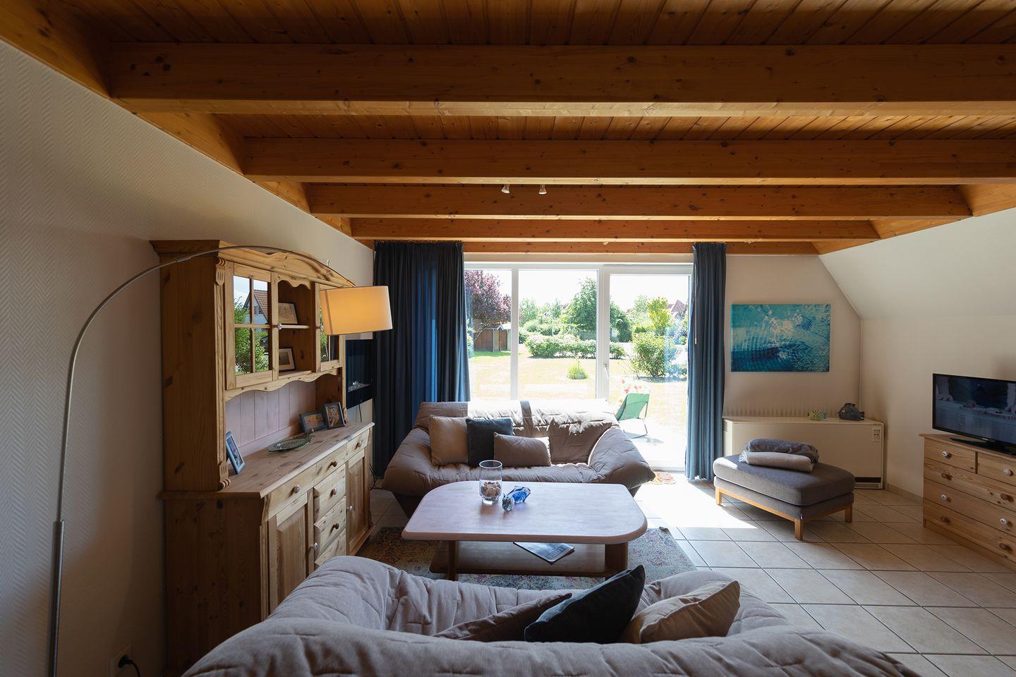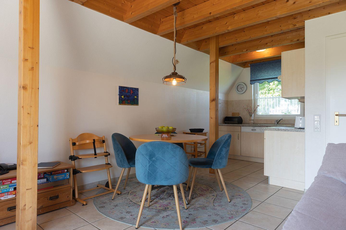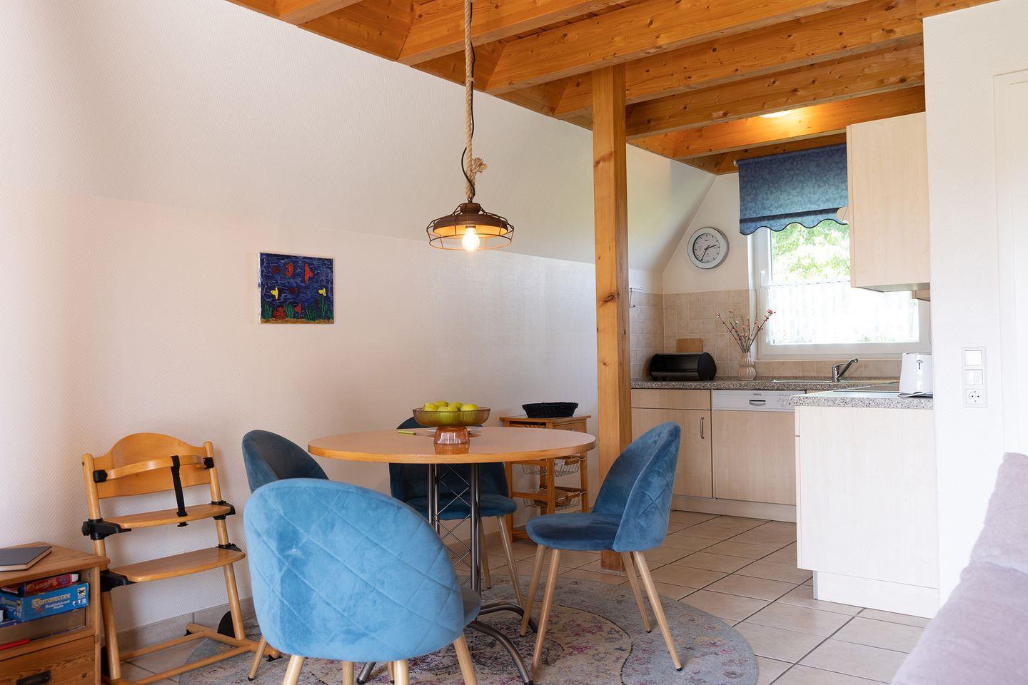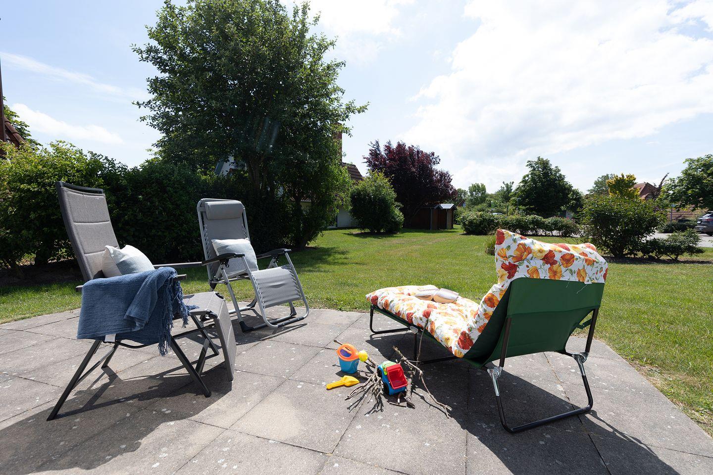 Kinderbett, Hochstuhl und Treppengitter sind vorhanden. Die möblierte Terrasse lädt zu langen Grillabenden ein, während die Abendsonne über dem Garten steht. Kostenfreie Parkplätze am Haus und eine E-Ladesäule in der Anlage machen die Anreise bequem.