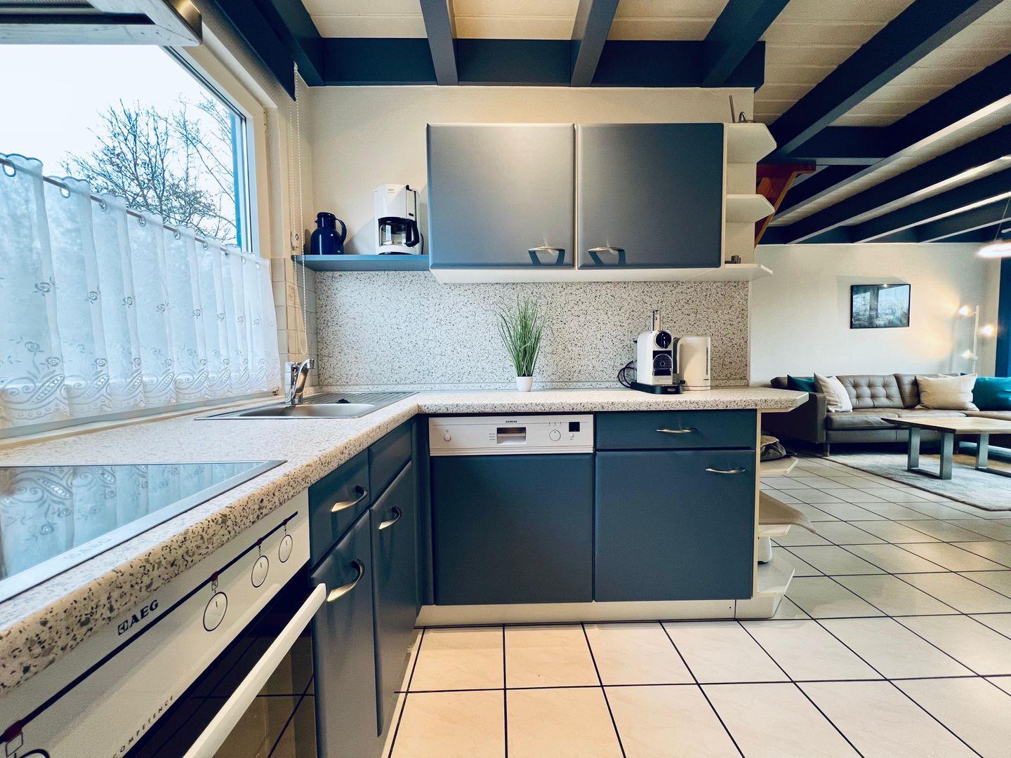Zwei Schlafzimmer, ein offener Wohnbereich mit Fliesen, Sofaecke und zwei TVs sowie eine komplett ausgestattete Küche mit Spülmaschine, Ceranfeld und Mikrowelle sorgen für Komfort. Kinderbett, Hochstuhl, Treppengitter und Steckdosensicherung sind ebenso vorhanden wie Bücher, Spiele und WLAN.