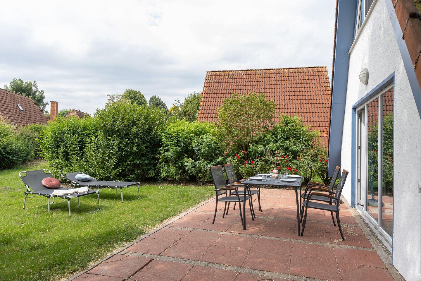 Das Bad hat eine Dusche, Fliegengitter, Kosmetikspiegel und Haartrockner. Im Garten warten Gartenhaus, Liegen, Grill und eine überdachte Terrasse: perfekt für Familienzeit am Meer.