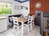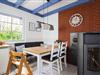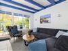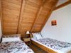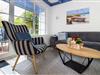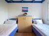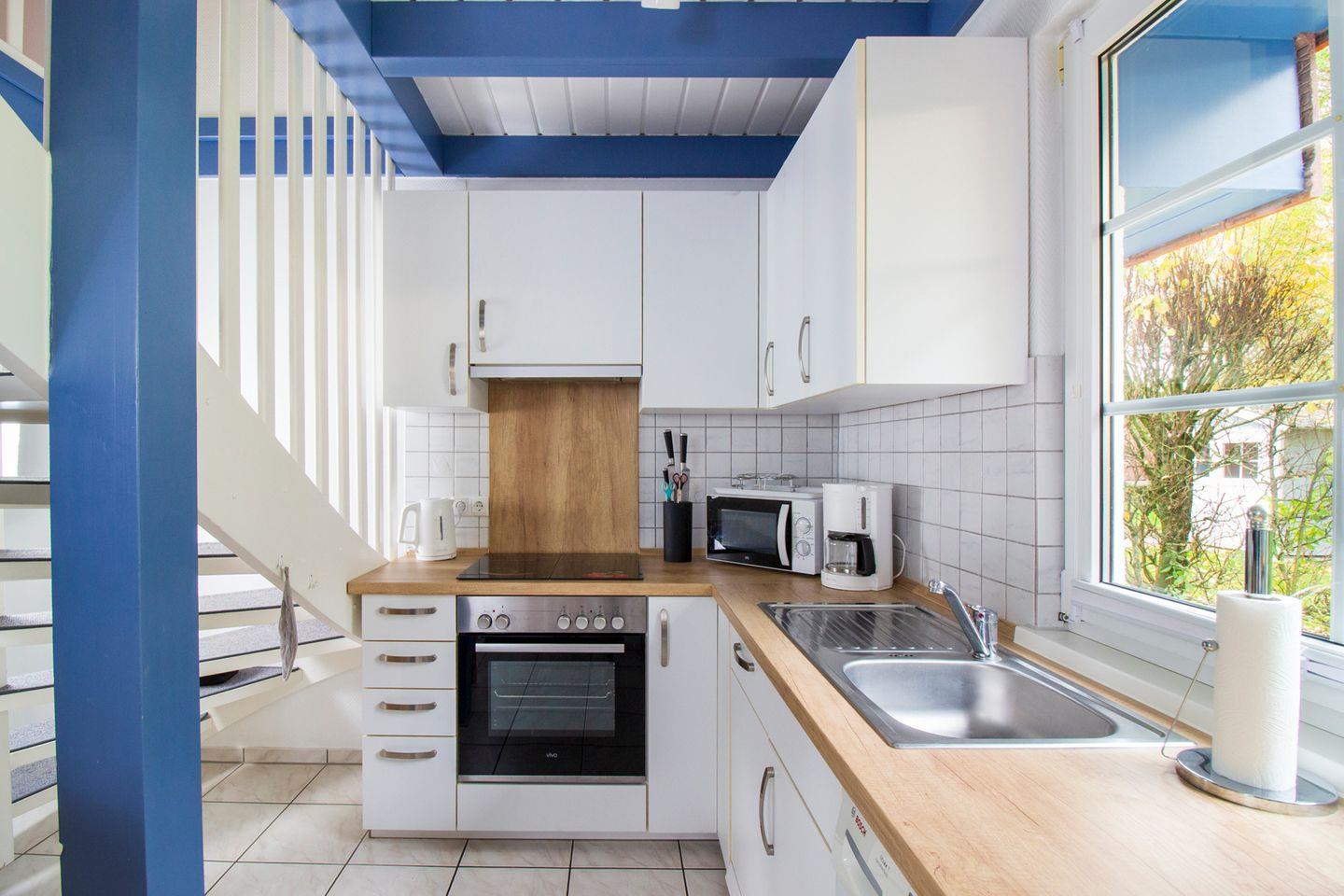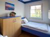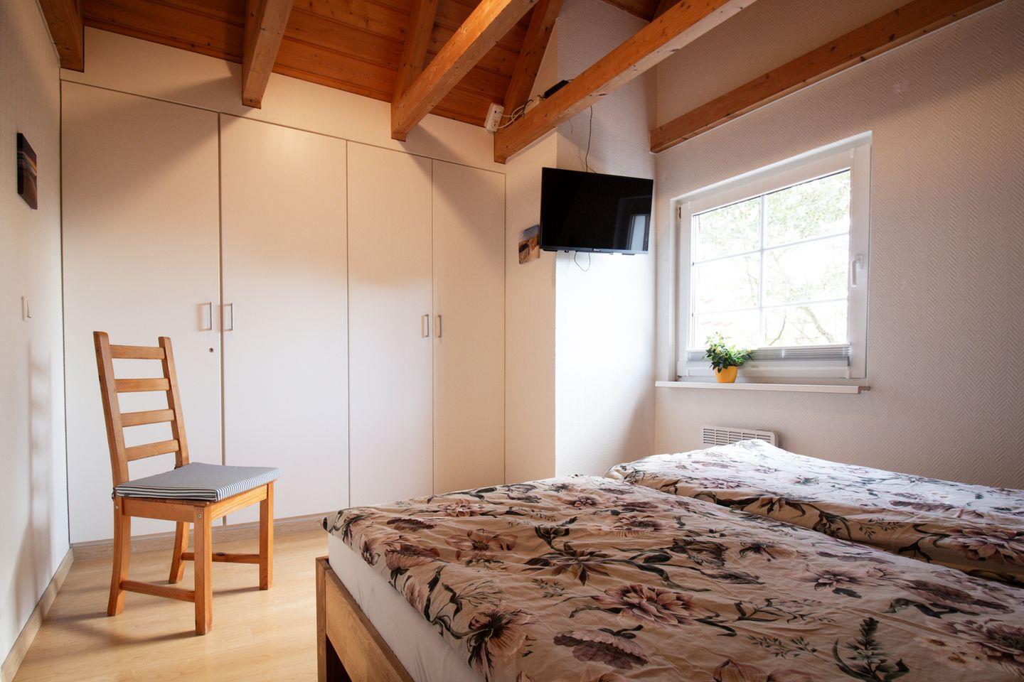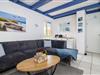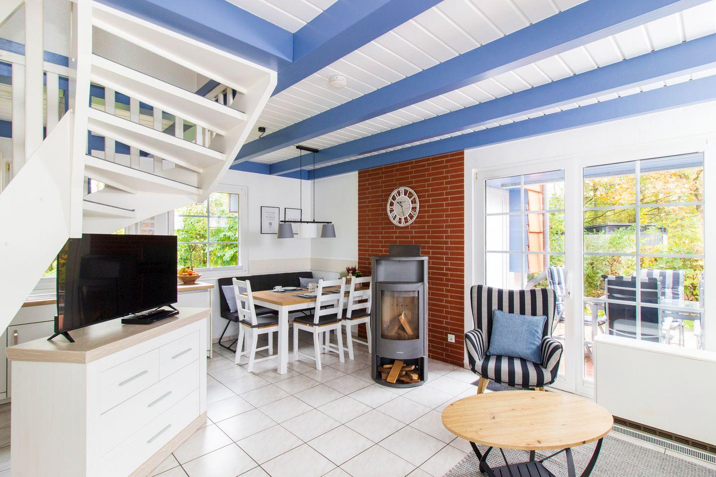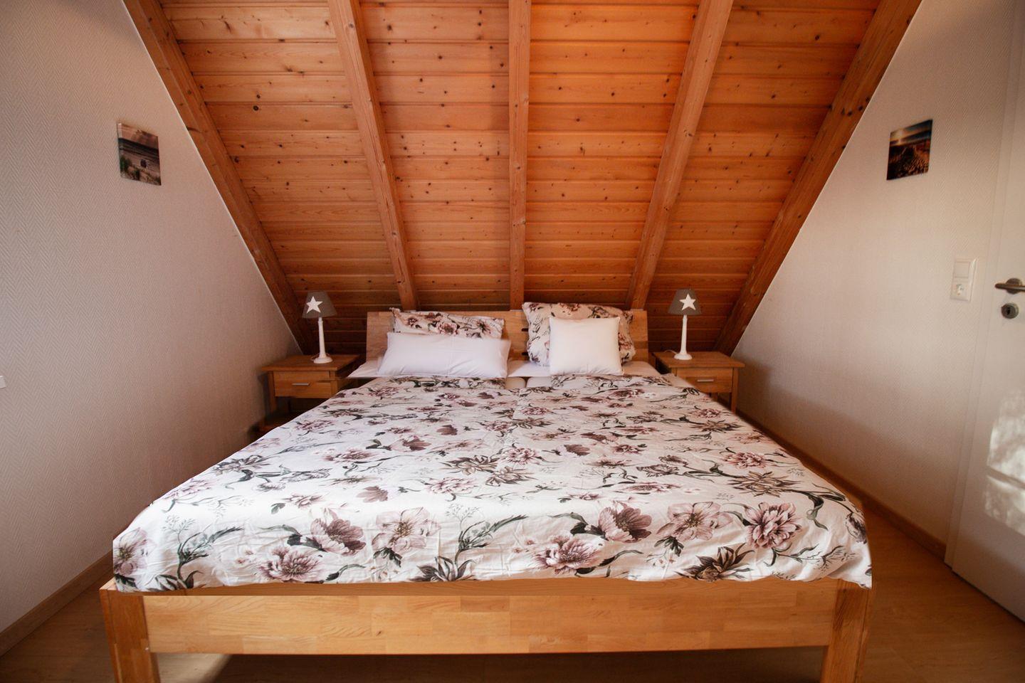 Im Erdgeschoss befinden sich ein Schlafzimmer mit erhöhten Betten, ein gemütlicher Wohnbereich mit Kaminofen sowie eine offene Küche mit großem Esstisch. Bücher, Spiele und helle Räume sorgen für entspannte Stunden, auch wenn das Wetter mal rauer wird. Das Obergeschoss mit Laminatboden bietet ein Elternschlafzimmer und ein weiteres mit getrennten Betten.