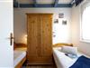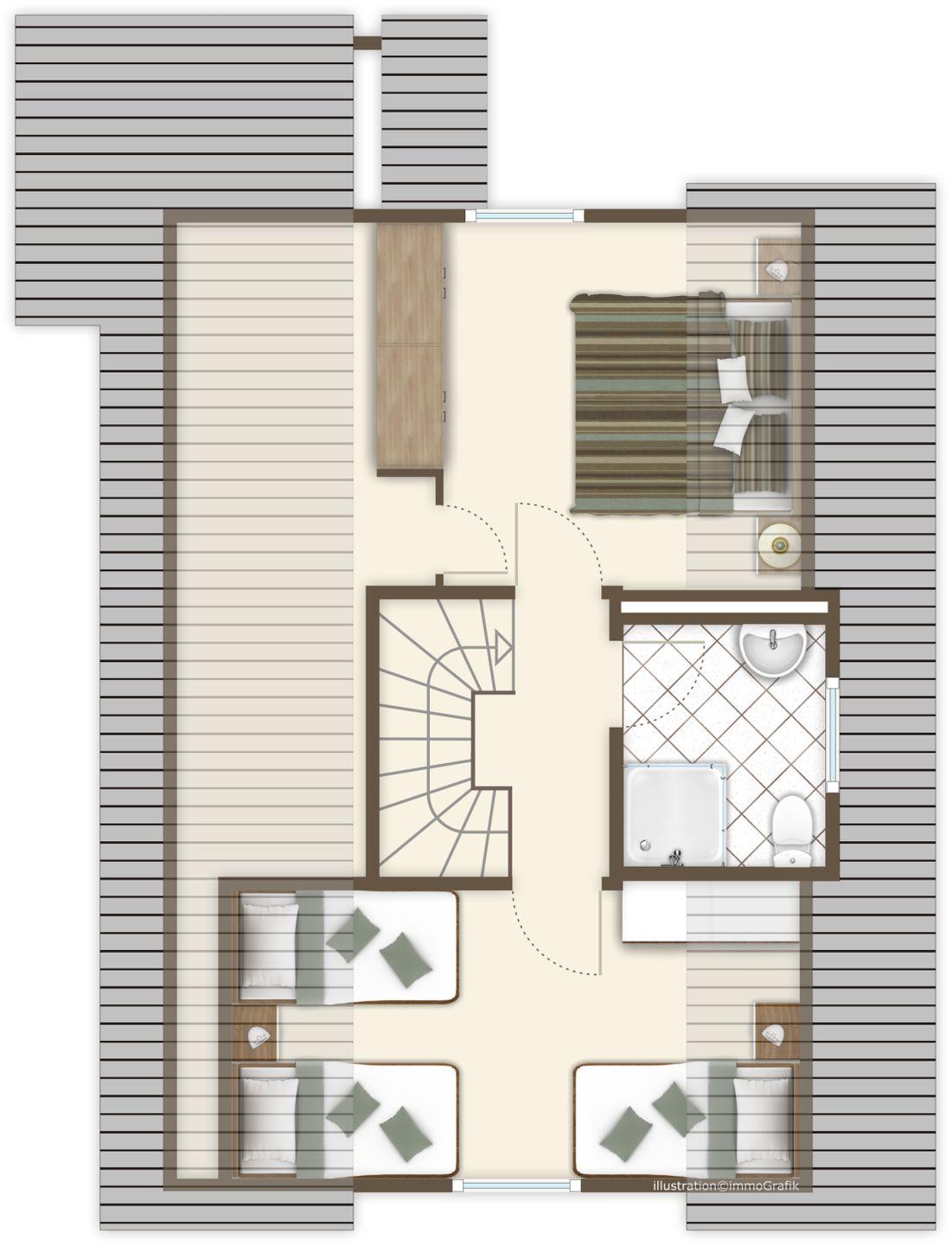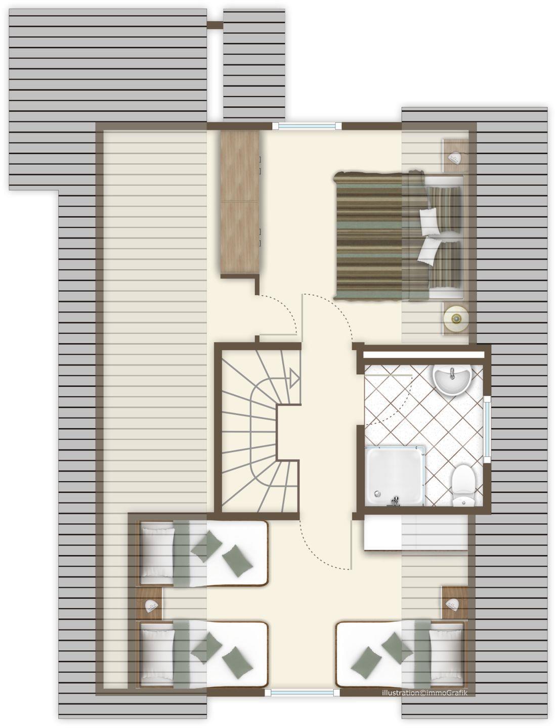 Unten: ein Schlafzimmer mit zwei Einzelbetten, Wohn-Essbereich mit offener Küche, Duschbad mit Waschmaschine. Oben: Elternschlafzimmer mit Doppelbett, Kinderzimmer mit zwei gemütlichen Schlafkojen und ein zweites Duschbad. Kinderbett und Hochstuhl stehen bereit. WLAN ist vorhanden.