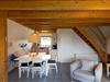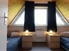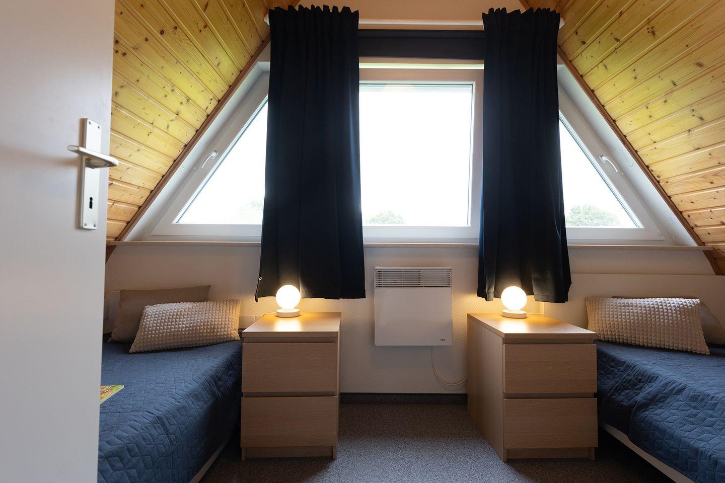 Unten wartet ein heller Wohnbereich mit offener Küche, Essplatz und Kaminofen. Wer mag, macht es sich hier nach einem Tag am Strand mit Tee und Buch gemütlich. Oben schlafen die Kinder in getrennten Betten, die Eltern im Doppelbett unter der Schräge. Alles ist iebevoll eingerichtet.
