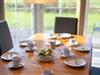 Im Garten wartet eine möblierte Terrasse mit freiem Blick über Wiesen und Felder – hier kann man essen, spielen, sitzen und die Ruhe genießen.