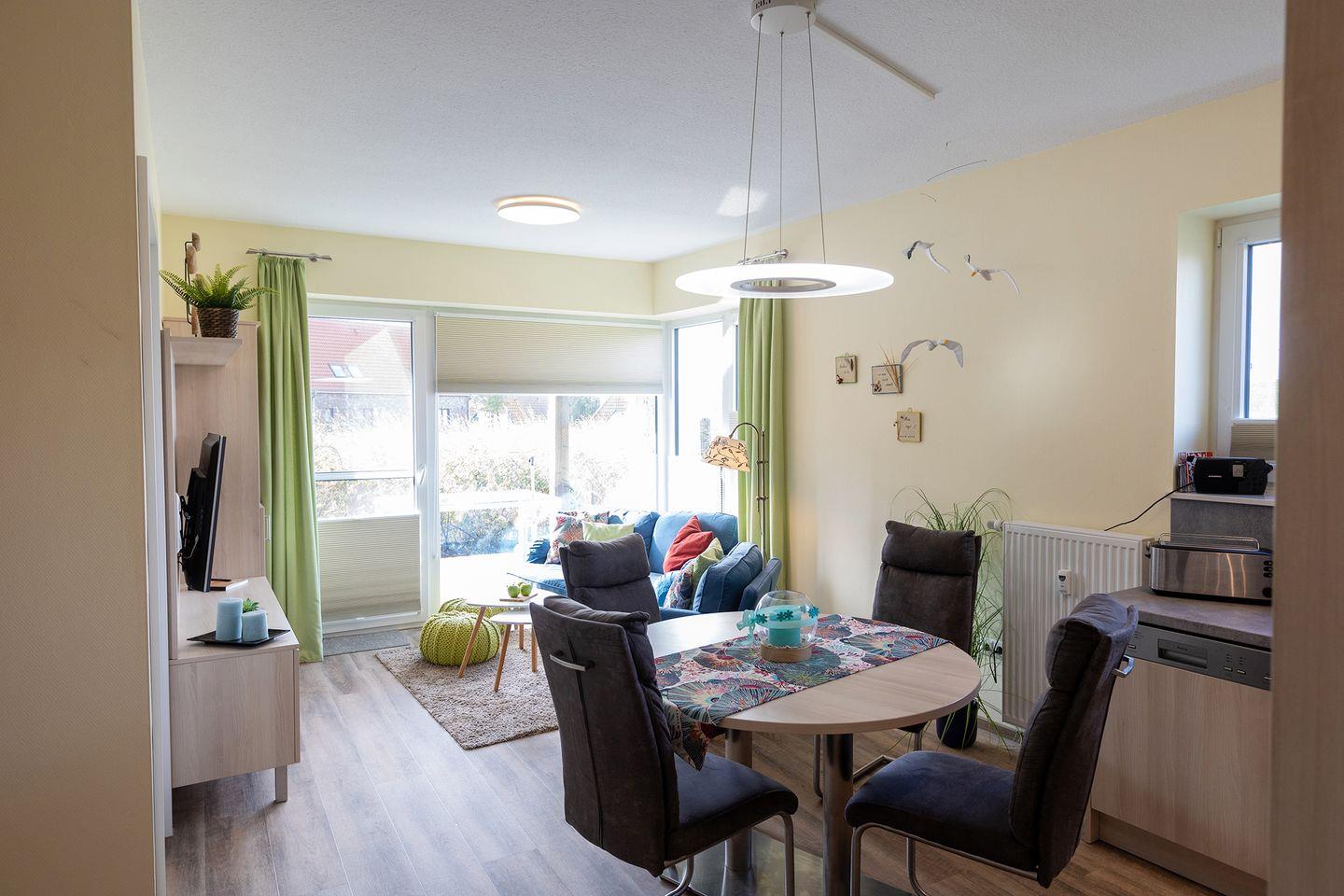 Ruhig gelegen hinter dem Deich: Diese Komfortferienwohnung im Erdgeschoss bietet auf 70?m² Platz für bis zu 4 Personen – mit zwei Schlafzimmern, moderner Küche, großer Wohnlandschaft und möblierter Terrasse. Ideal für Familien, die die Nordsee ganz entspannt entdecken möchten. Kinderbett, Hochstuhl, WLAN und Parkplatz inklusive und der Strand ist nur einen Spaziergang entfernt.