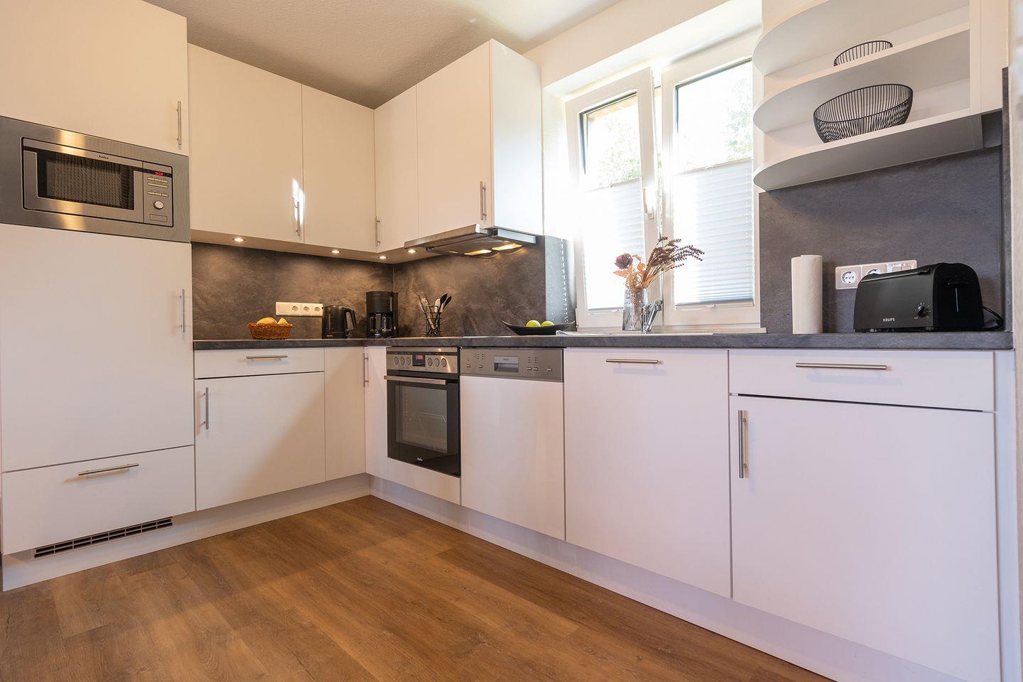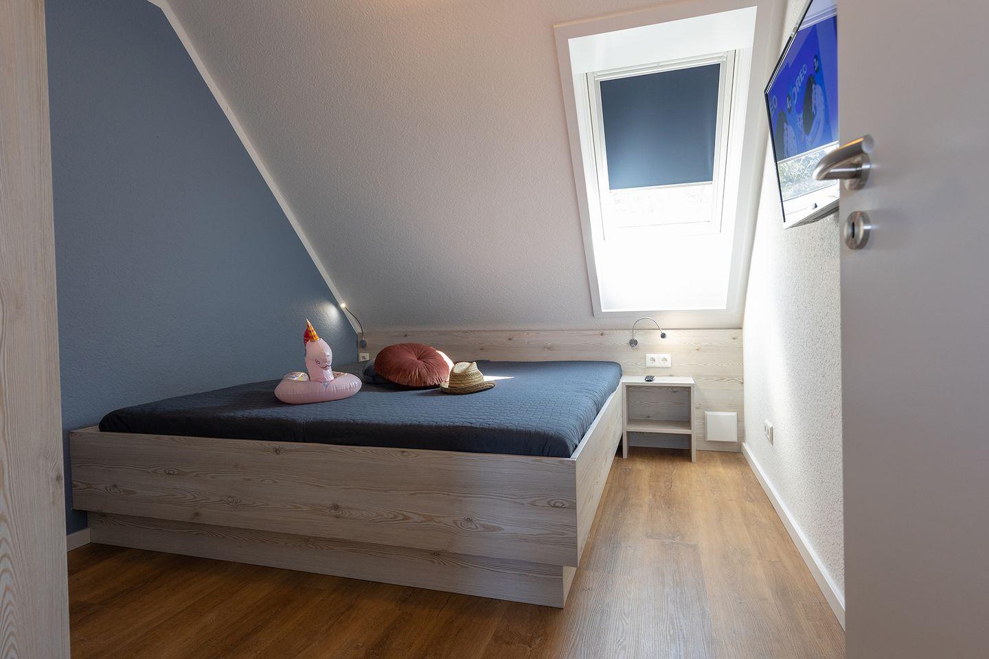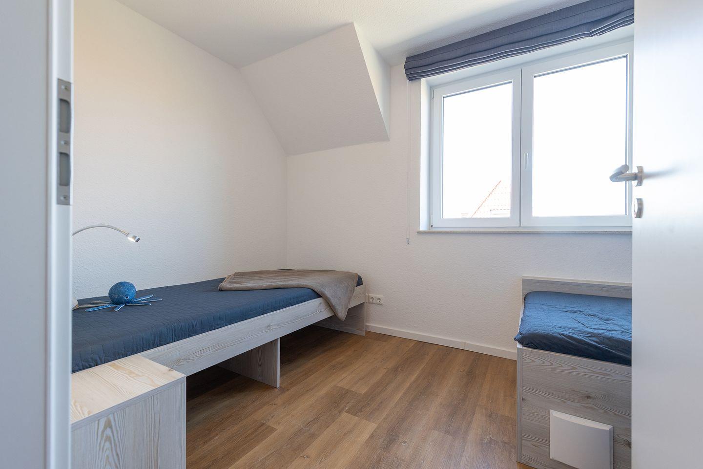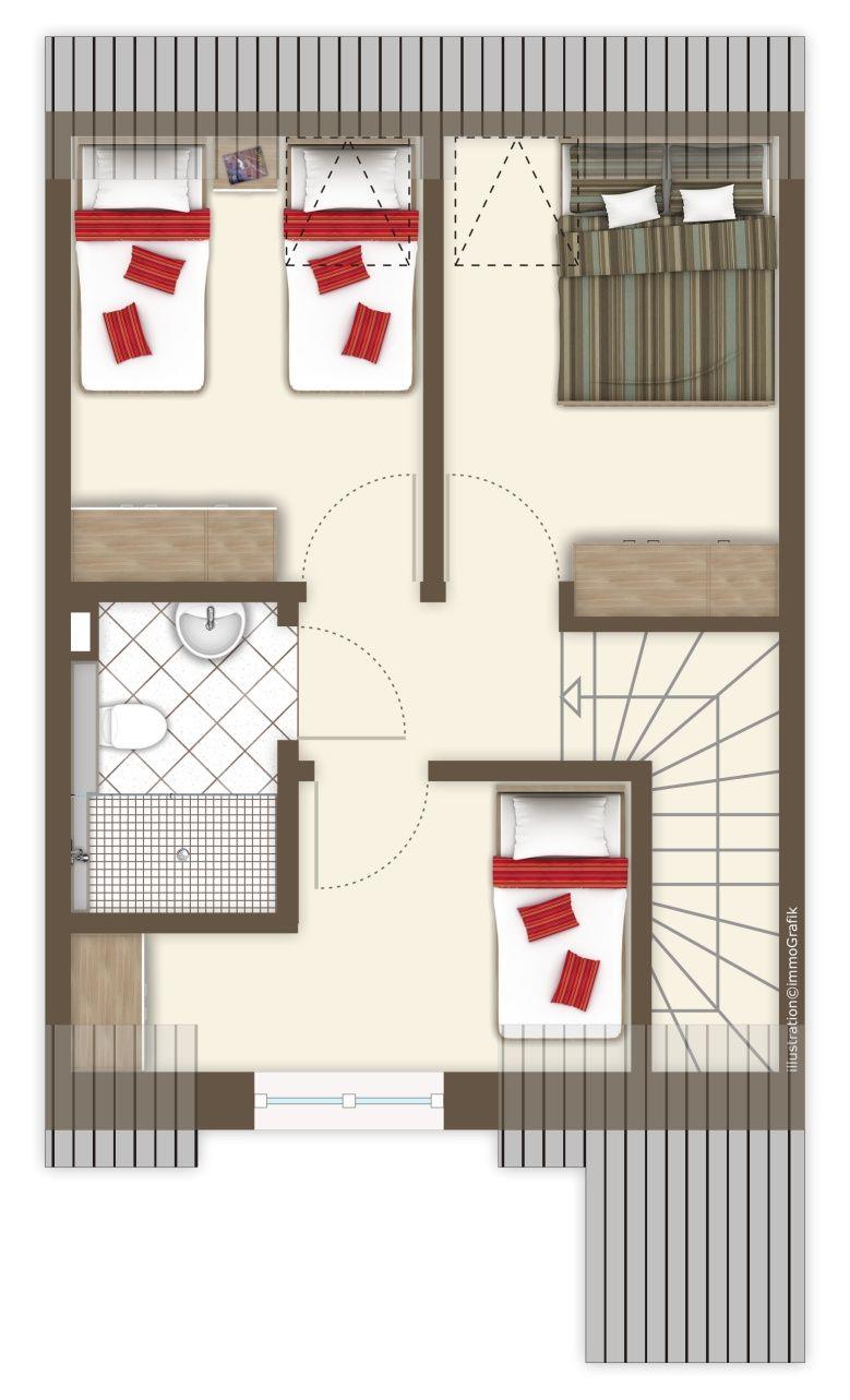Im Erdgeschoss: ein heller Wohn-Essbereich mit gemütlicher Wohnlandschaft, offener Küche, Esstisch und Gäste-WC. Im Obergeschoss: drei Schlafzimmer – zwei mit Doppelbetten, eins mit zwei Einzelbetten – sowie ein Duschbad. Alle Schlafräume können verdunkelt werden und sind mit Laminat ausgelegt. Fußbodenheizung und automatische Be- und Entlüftung sorgen für ein angenehmes Raumklima.