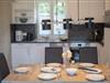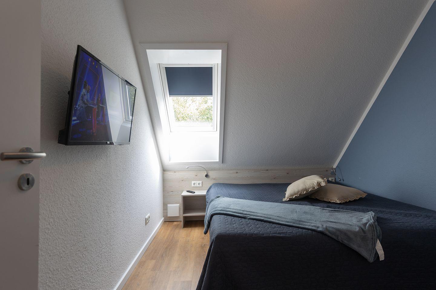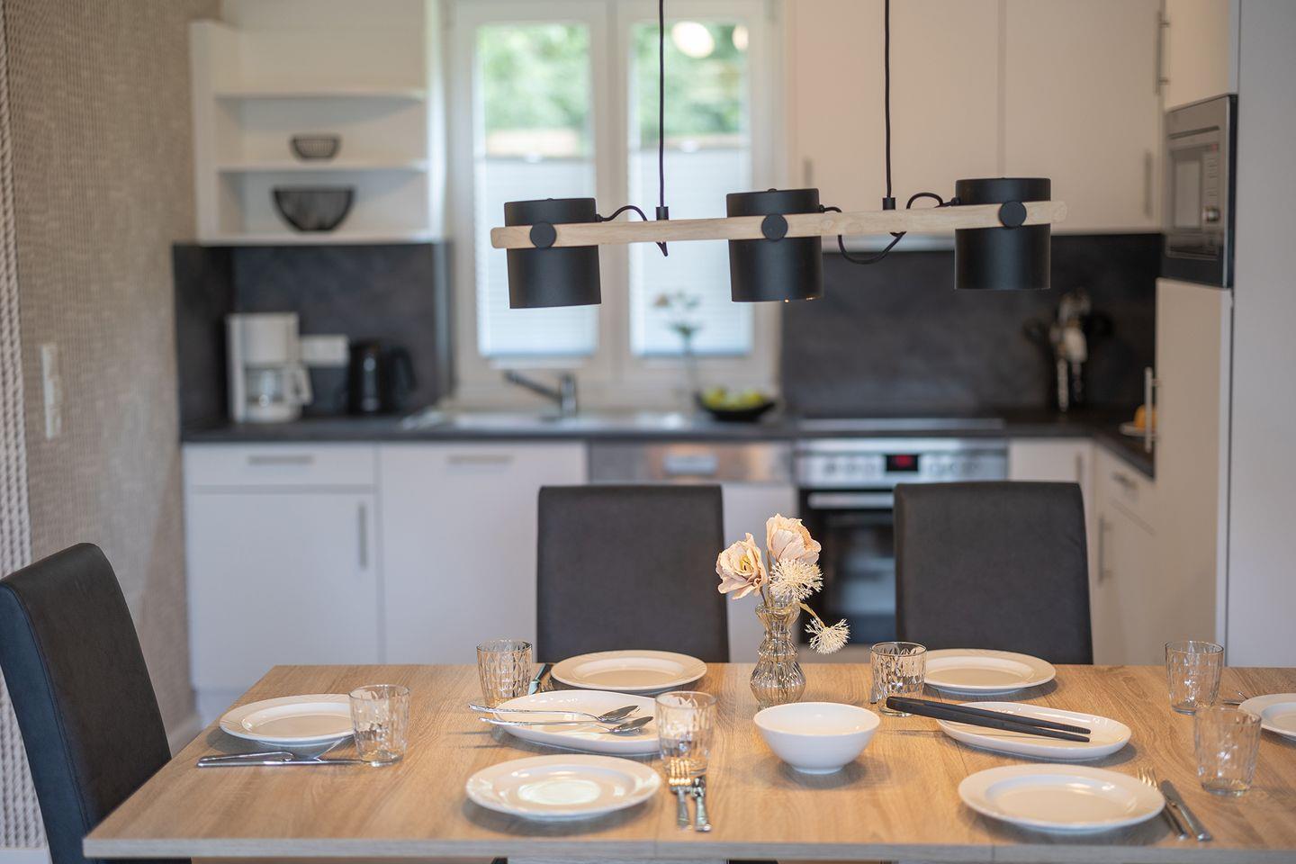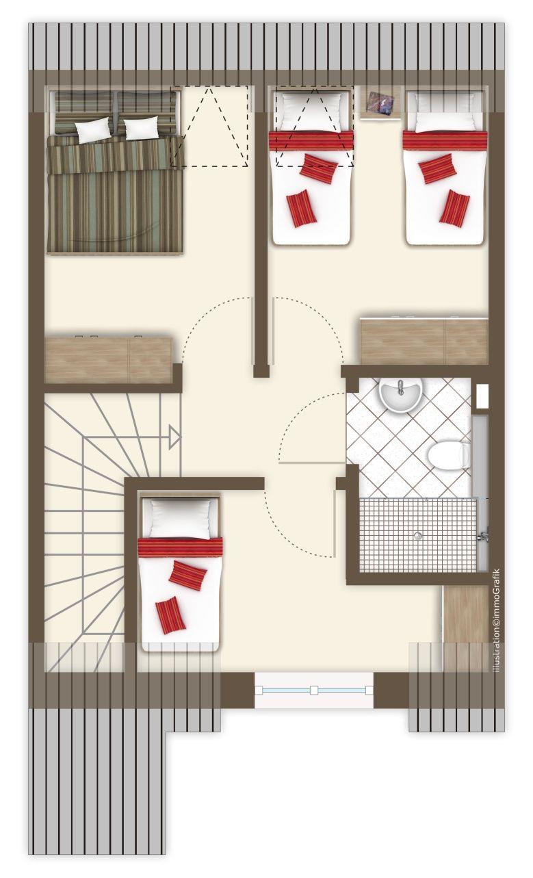 Im Erdgeschoss: ein heller Wohn-Essbereich mit gemütlicher Wohnlandschaft, offener Küche, Esstisch und Gäste-WC. Im Obergeschoss: drei Schlafzimmer – zwei mit Doppelbett und eins mit zwei Einzelbetten – sowie ein Duschbad. Alle Schlafräume lassen sich verdunkeln und sind mit Laminat ausgelegt. Fußbodenheizung und automatische Be- und Entlüftung sorgen für ein angenehmes Raumklima.