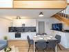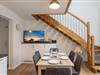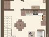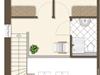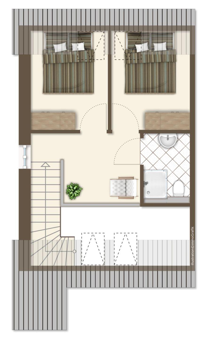 Im Erdgeschoss: ein heller Wohn-Essbereich mit gemütlicher Wohnlandschaft, offener Küche, Esstisch und Gäste-WC, sowie ein Schlafzimmer mit Doppelbett. Im Obergeschoss: zwei Schlafzimmer – mit Doppelbett, sowie ein Duschbad. Alle Schlafräume lassen sich verdunkeln und sind mit Laminat ausgelegt. Fußbodenheizung und automatische Be- und Entlüftung sorgen für ein angenehmes Raumklima.