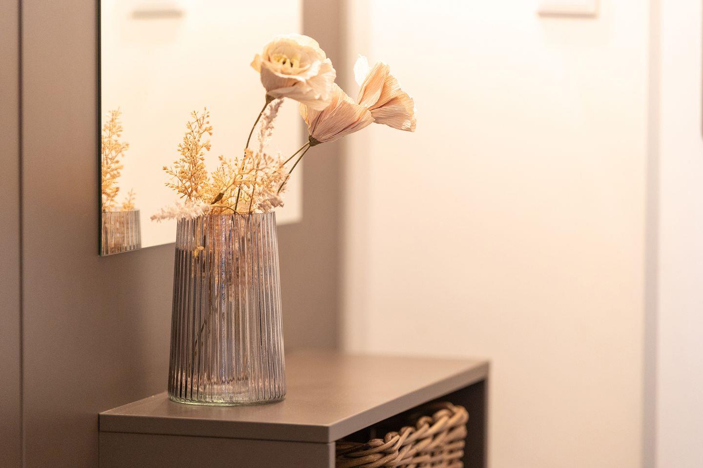 Der Balkon öffnet den Blick weit über die Felder. Im Strandkorb lässt sich der Wind in Ruhe genießen. Drinnen gibt’s Spülmaschine, Waschmaschine und WLAN – praktisch für den Familienalltag. Auch an die Kleinen ist gedacht: Kinderbett und Hochstuhl sind da.