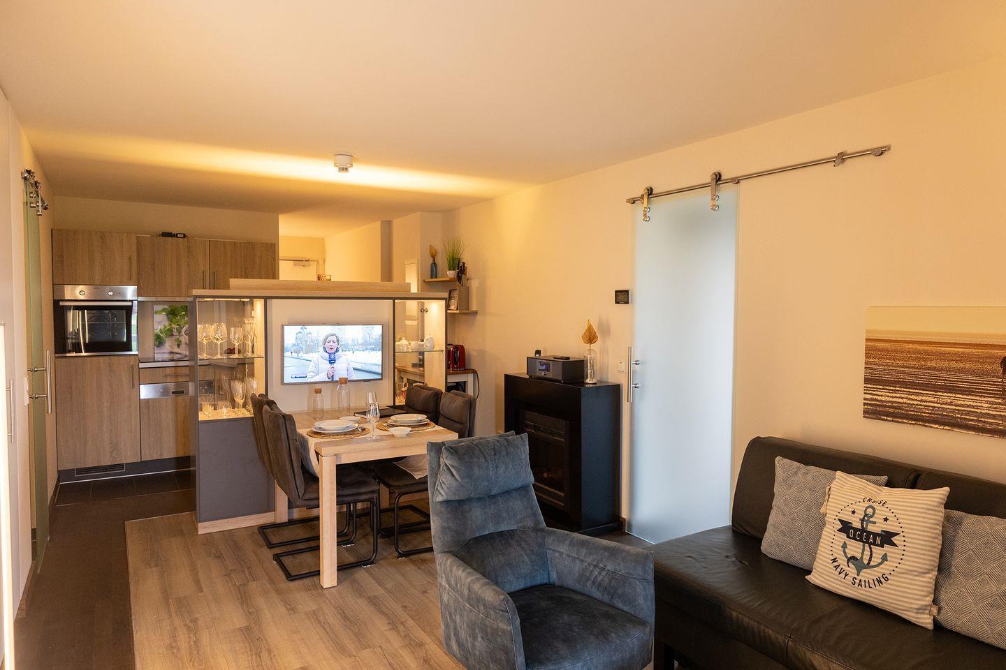 Moderne Ferienwohnung für bis zu 4 Personen in Wremen, mit Sauna, Kaminofen und großem Balkon samt Strandkorb. Strand, Kutterhafen und Deich sind fußläufig erreichbar. Ideal für Familien mit Kindern und inklusive Spülmaschine, Waschmaschine und WLAN.