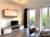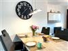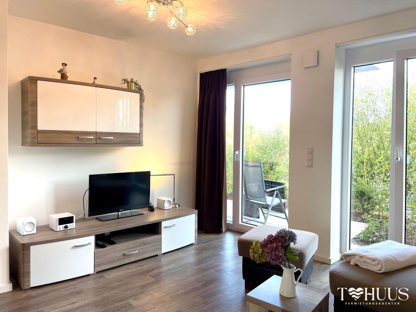 Das helle und modern eingerichtete Wohnzimmer mit gemütlicher Sitzgarnitur, Flachbild-TV, DVD-Player und einer Essecke mit großem Esstisch sorgt für eine angenehme Atmosphäre. Die offene Küche ist vollständig ausgestattet, damit du deine Mahlzeiten bequem zubereiten kannst.