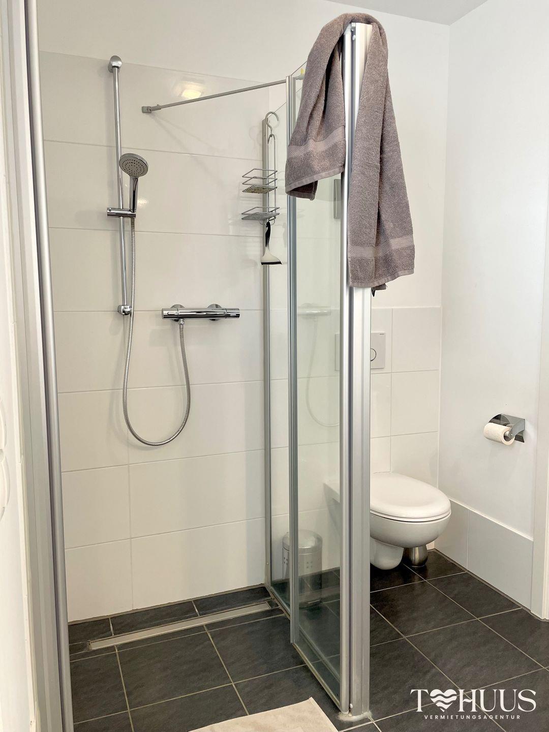 Das moderne Duschbad ist ausgestattet mit einem Waschtisch, einer ebenerdigen Dusche, Föhn und Fenster.