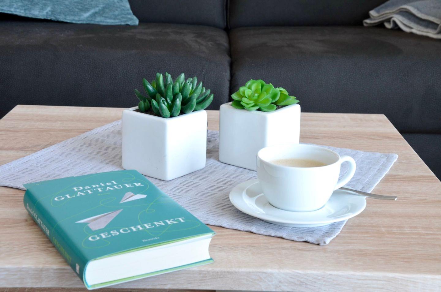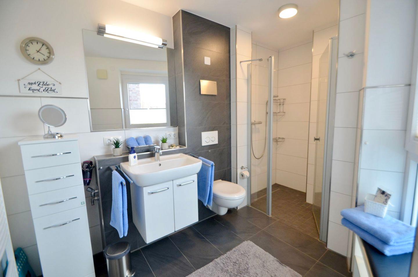 Das moderne Badezimmer bietet eine ebenerdige Dusche und ausreichend Stauraum. Im Untergeschoss findest du einen abschließbaren Fahrradkeller und einen Waschraum mit Waschmaschine und Trockner (gegen Gebühr).