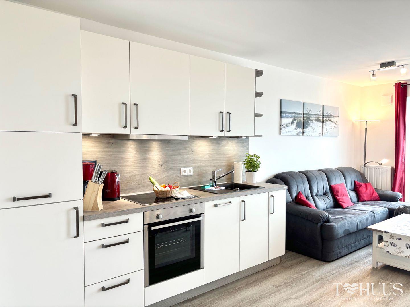 Das Penthouse umfasst zwei geschmackvoll eingerichtete Schlafzimmer mit Verdunkelungsmöglichkeiten – eines mit einem gemütlichen Doppelbett (2,00 m x 2,00 m) und das andere mit zwei Einzelbetten (0,90 m x 2,00 m). Der Wohnbereich lädt mit einem bequemen Sofa und einem großen LED-TV zum Verweilen ein. Die moderne Küche ist komplett ausgestattet – ob Geschirrspüler, Backofen, Mikrowelle oder Cerankochfeld, hier fehlt es an nichts. Ein stilvolles Badezimmer mit bodengleicher Dusche und Tageslicht runden den Komfort ab.