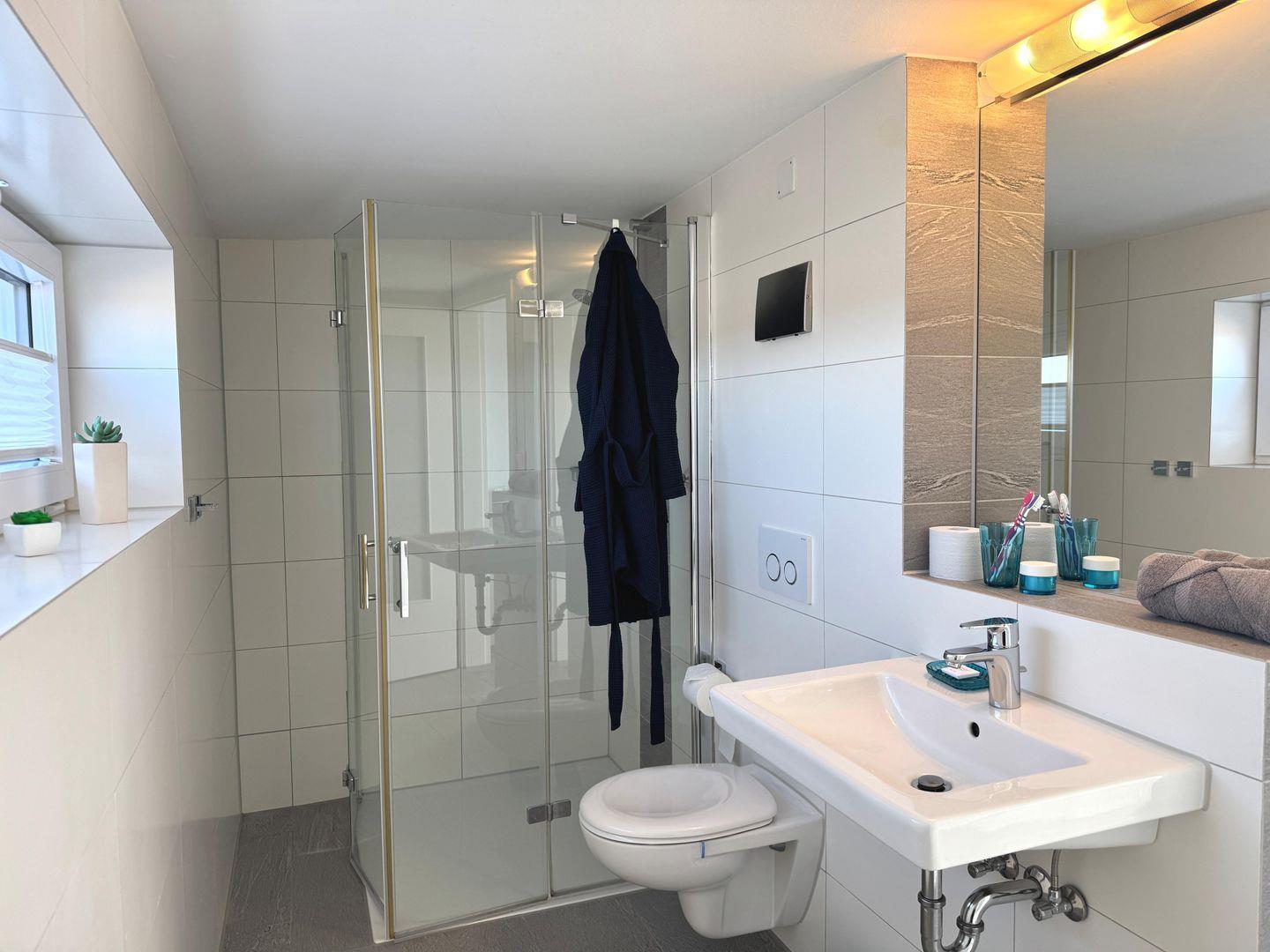 In den zwei gemütlichen Schlafzimmern mit hochwertigen Boxspringbetten und Außenrollläden findest du erholsamen Schlaf. Der Wohnbereich lädt mit einem bequemen Sofa und einem großen LED-TV zum Verweilen ein. Die moderne Küche ist komplett ausgestattet – ob Geschirrspüler, Backofen, Mikrowelle oder Cerankochfeld, hier fehlt es an nichts. Zwei stilvolle Badezimmer mit bodengleichen Duschen und Tageslicht runden das Komfortangebot ab.