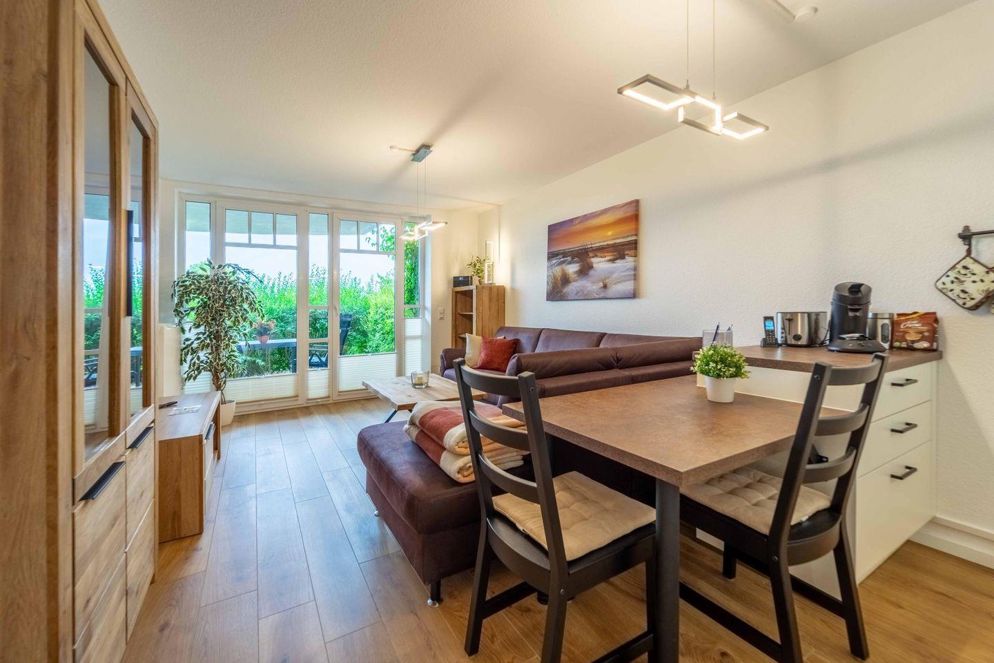 Die 45 qm große Ferienwohnung bietet dir ein offenes Wohn- und Esszimmer mit einer modernen, voll ausgestatteten Küche und einer großen Fensterfront zur Terrasse. Hier kannst du die frische Nordseeluft genießen und entspannte Abende verbringen. Das kleine Schlafzimmer ist ideal für zwei Personen und sorgt für erholsame Nächte. Das Badezimmer ist modern und funktional gestaltet.