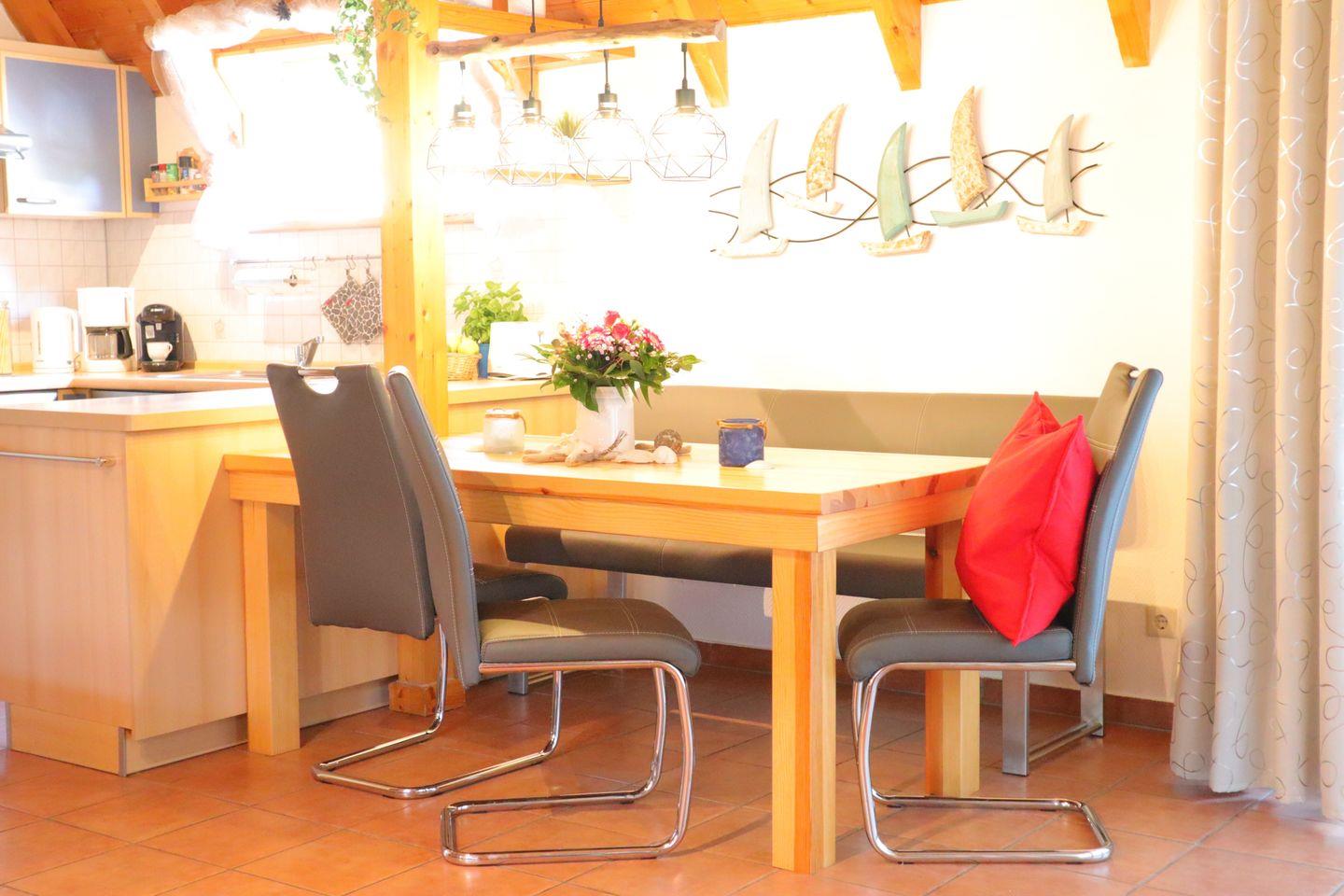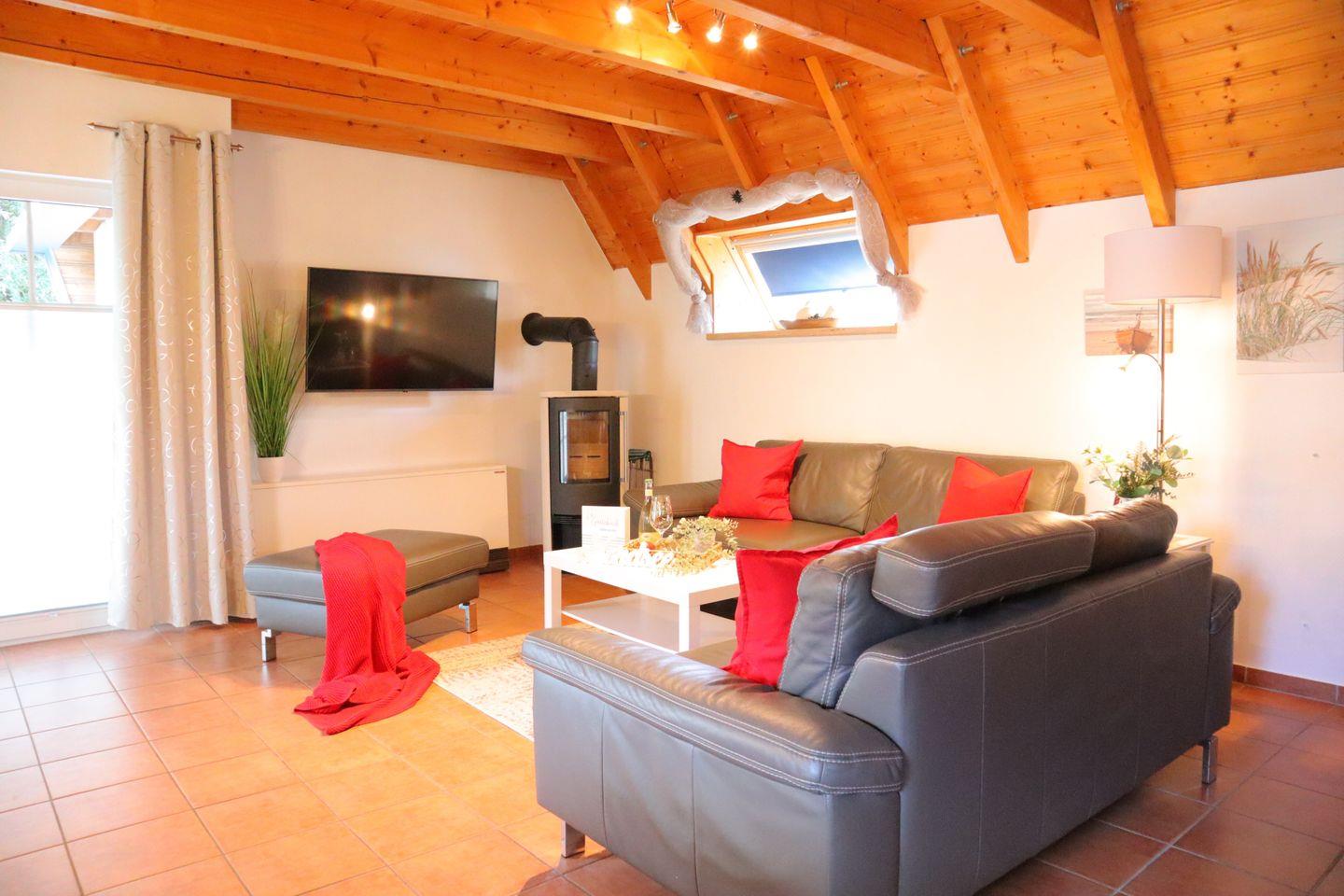 Auf 85 m² bietet es Platz für bis zu 6 Personen und überzeugt mit einem gemütlichen Wohnbereich samt Kaminofen, einer modernen Küche und drei komfortablen Schlafzimmern.