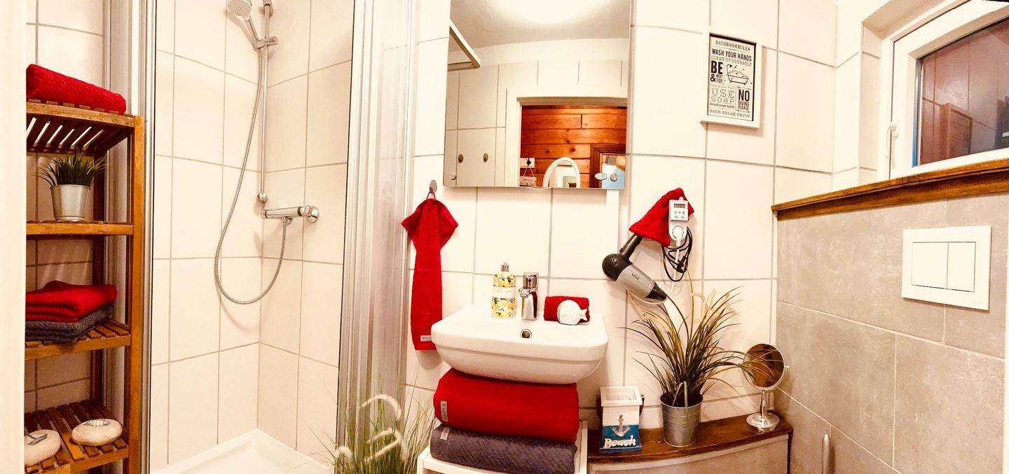 - modernes Badezimmer mit Dusche für einen frischen Start in den Tag.