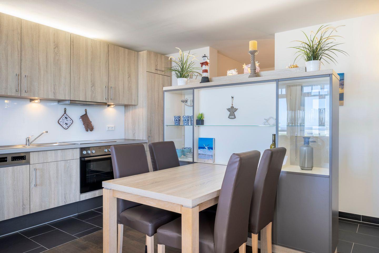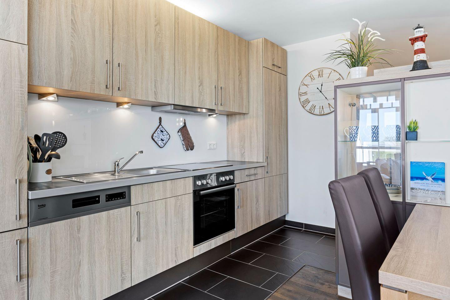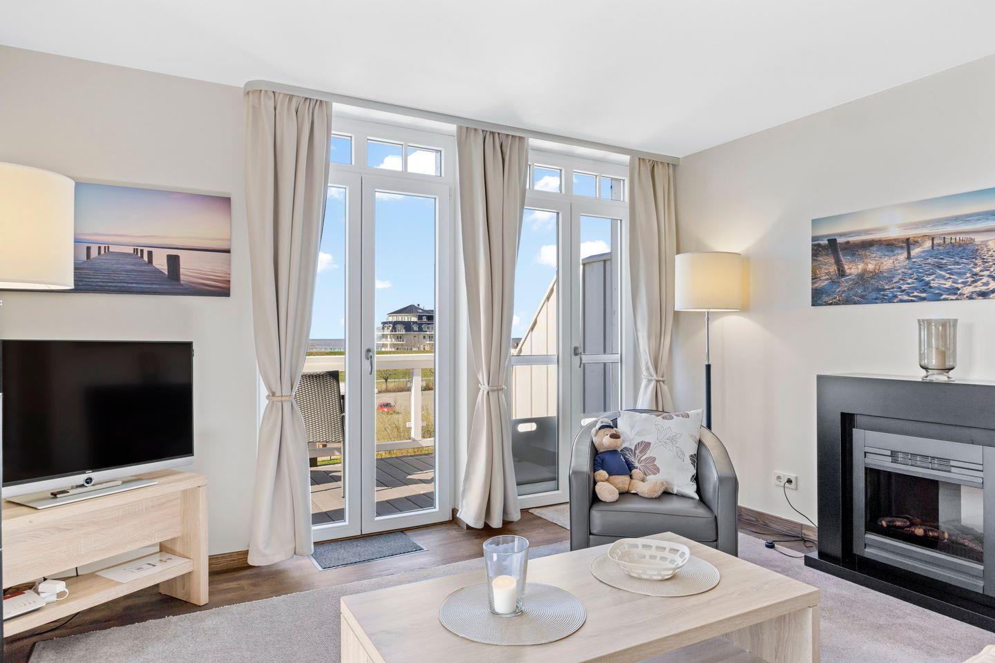 Das moderne und helle Nichtraucher-Apartment mit bodentiefen Fenstern verfügt über kostenfreies WLAN und eine großzügig konzipierte und voll ausgestattete offene Küche mit Geschirrspüler, Kaffeepadmaschine (Senseo), Toaster, Mikrowelle, Wasserkocher, Eierkocher, Kühlschrank mit Tiefkühlfach und Ceranherd mit Backofen. Im Schlafzimmer stehen euch ein Doppelbett (1,80 x 2,00 m), im Wohnbereich eine Schlafcouch (1,40 x 1,90 m), ein SMART-TV (43 Zoll), ein Radio und Gesellschaftsspiele zur Verfügung. Der Elektrokamin verströmt eine behagliche Atmosphäre. Ein Kinderbett kann gegen Entgelt aufgestellt werden und auf Wunsch könnt ihr einen Hochstuhl hinzubuchen. Bügeleisen- und Bügelbrett sind im Apartment vorhanden.