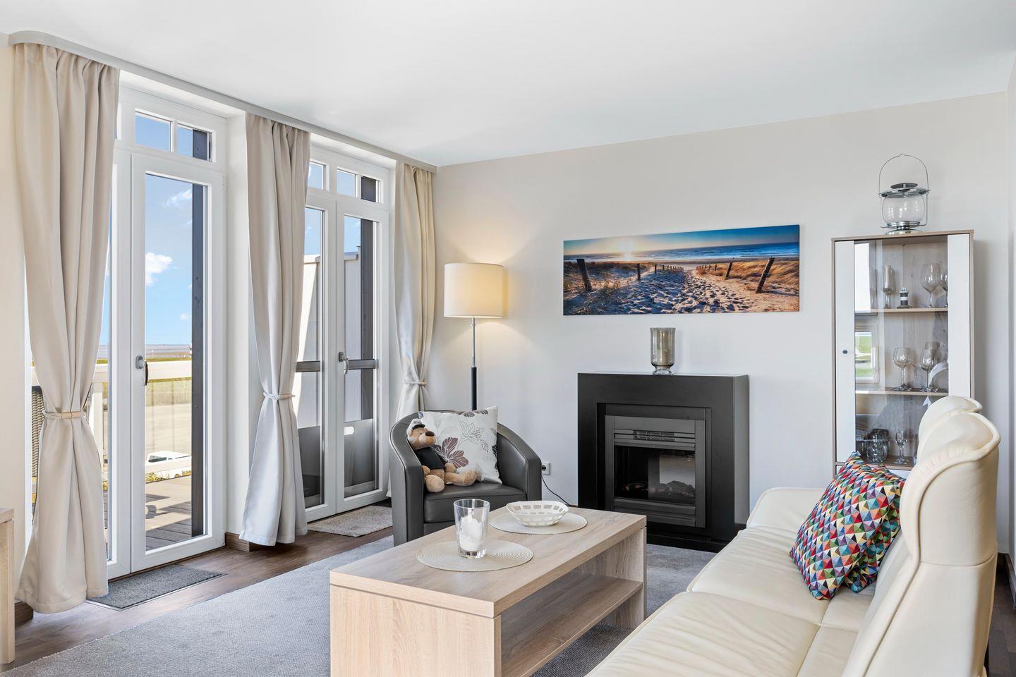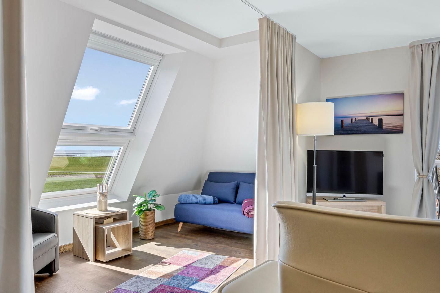 Das 88 qm große 2-Zimmer Penthaus-Apartment ist für bis zu 4 Personen geeignet und befindet sich in ausgesuchter, ruhiger Lage. Besonders hervorzuheben sind der großartige Ausblick zu Deich und Meer, die zwei Balkone und die private Sauna des hochwertigen Ferienapartments.