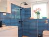 Das Badezimmer ist in edler Natursteinoptik gefliest und mit einer komfortablen Dusche ausgestattet.