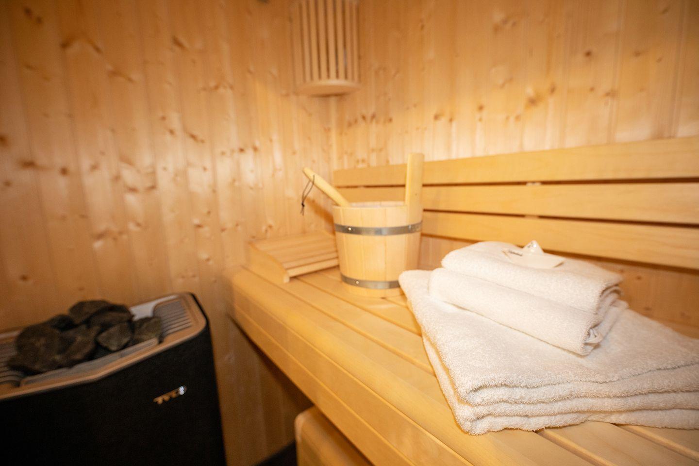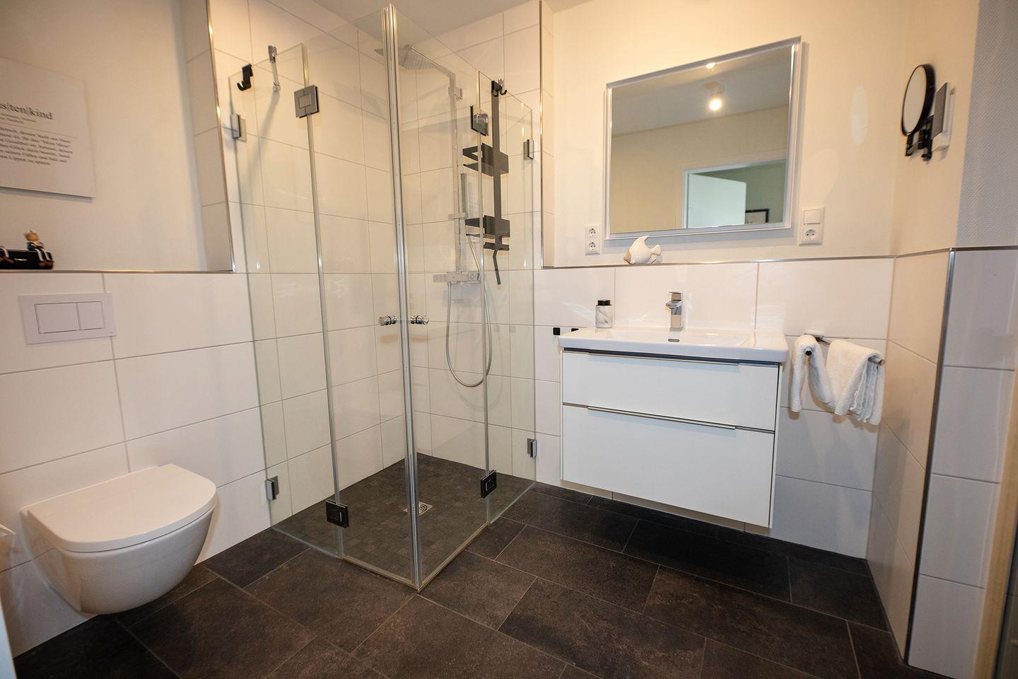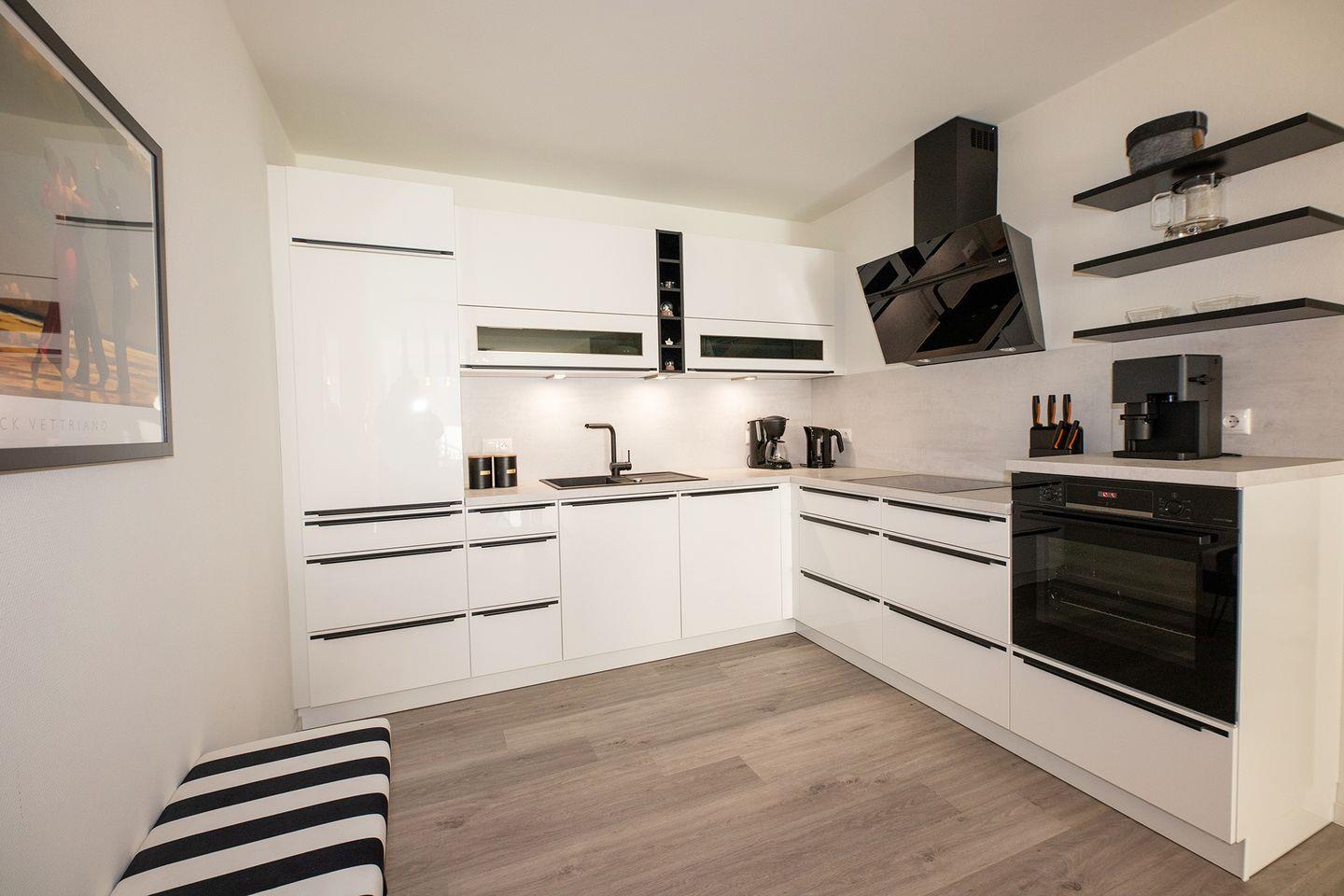 Die Küche ist komplett ausgestattet mit Induktionsherd, Spülmaschine und allem, was man zum Selbstversorgen braucht. Besonderheit hier: die eigene Sauna, ideal nach windigen Strandtagen oder Radtouren durchs flache Wurster Land. Familien finden Babybett und Hochstuhl vor, Hunde sind willkommen.
