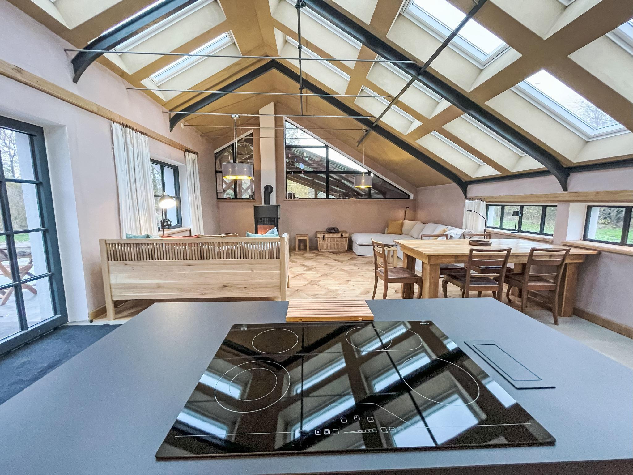 "Tiny House de luxe", 1-room chalet 65 m2, on the ground floor. Bright, partly with sloping ceilings, fully renovated in 2024, very stylish and cosy furnishings: open living/sleeping room with 1 sofabed (100 cm, length 200 cm), 1 double sofabed (180 cm, length 200 cm), Scandinavian wood stove. Exit to the terrace. Open kitchen (oven, dishwasher, 4 ceramic glass hob hotplates, kettle, electric coffee machine) with dining table and kitchen corner. Shower/WC. Parquet floors, natural stone floors. Large terrace 20 m2. Terrace furniture. Beautiful view of the garden. Facilities: washing machine. Parking (1 car) at the house. Please note: non-smoking house. The furniture and window sills are made from our own wood from the adjacent forest. The walls are made of sand-lime brick. Bookings accepted for holiday purposes only.