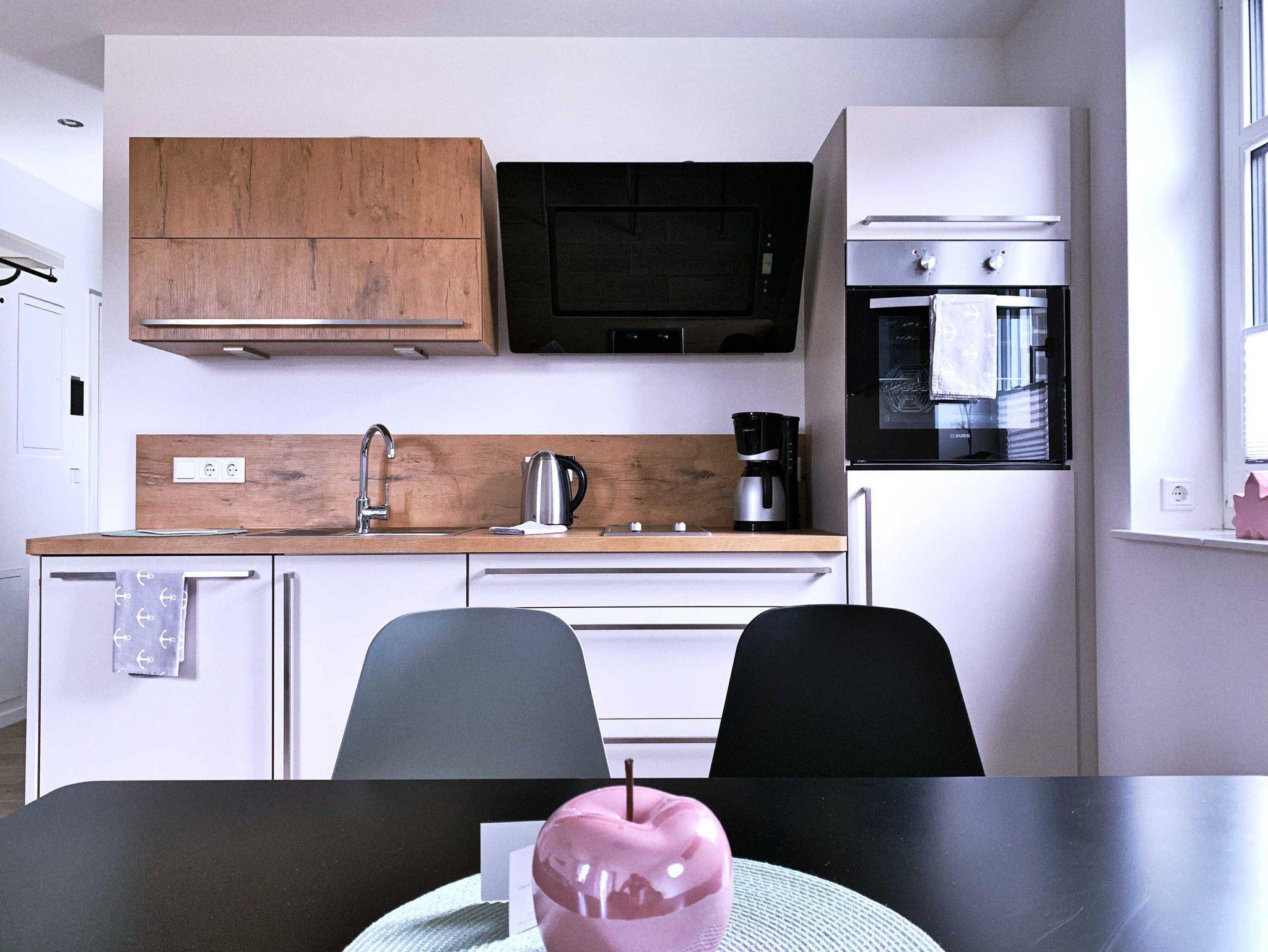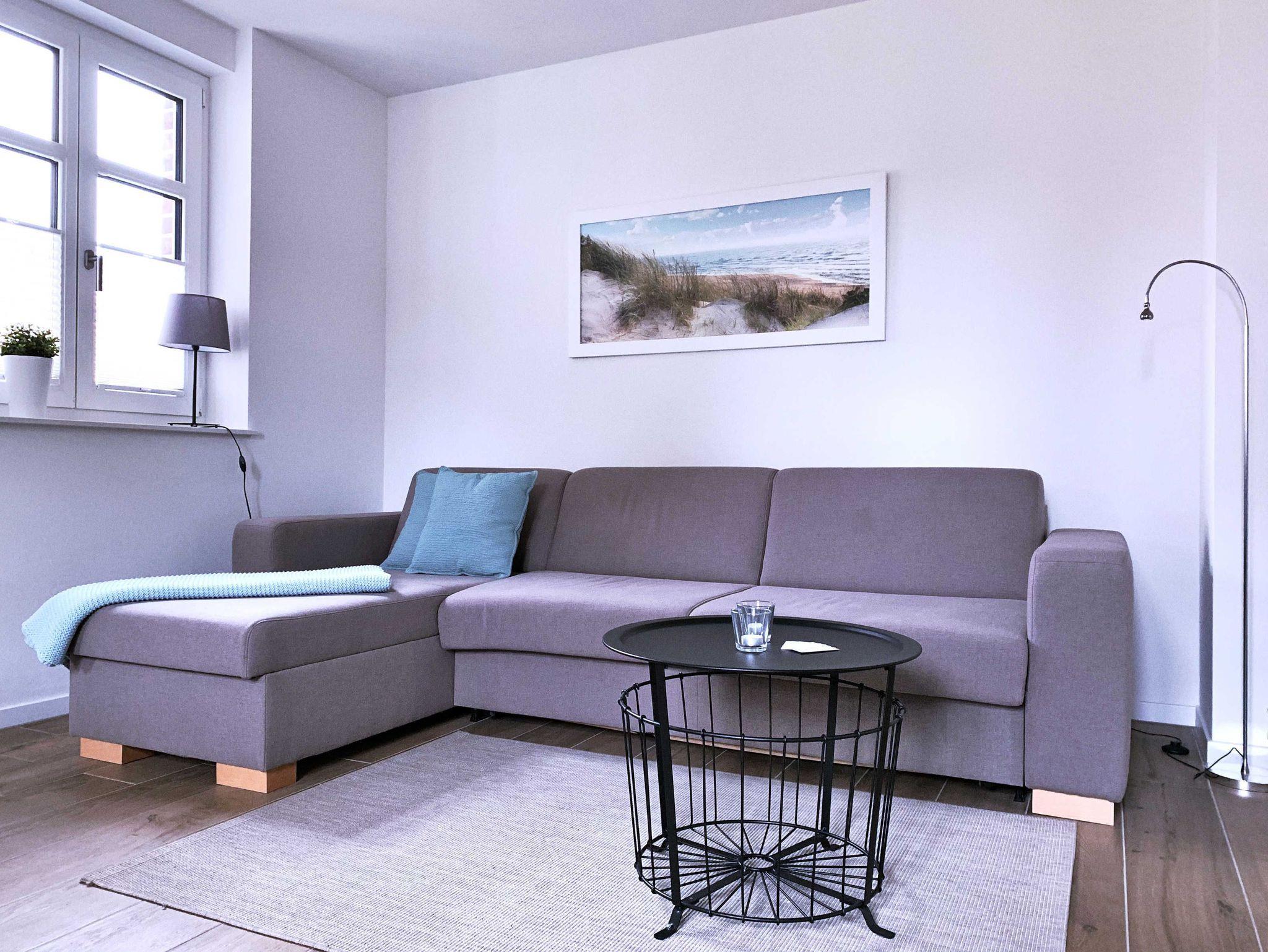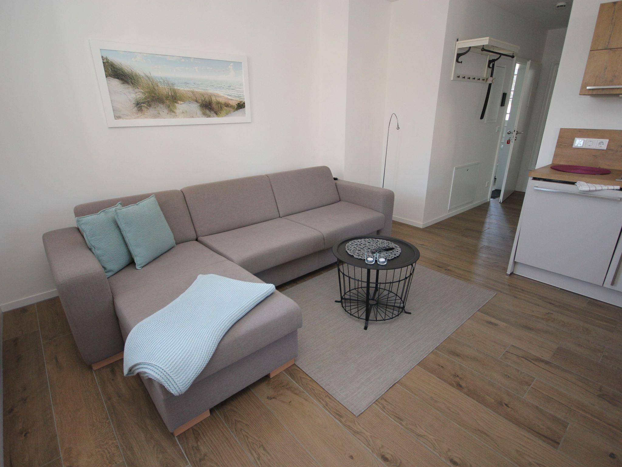 Die offene Wohnküche wurde mit SAT-TV, kostenlosem WLAN-Gastzugang, einer Küchenzeile und einer Schlafcouch ausgestattet.
