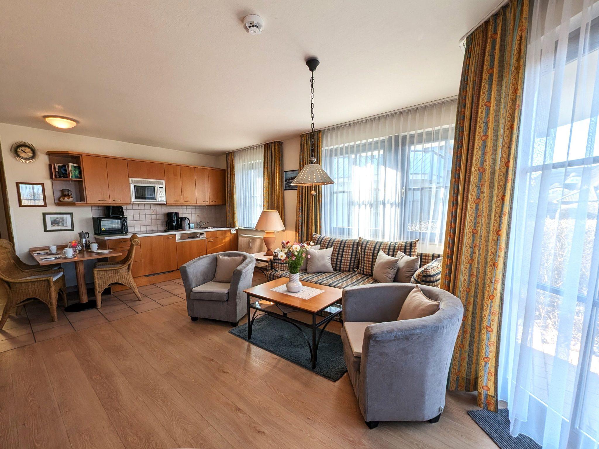 die helle und freundliche Wohnung liegt in direkter Strandlage. Die Terrasse liegt süd- westseitig und lädt zum gemütlichen Frühstück oder Abendessen ein, oder genießen Sie einfach die traumhaften Sonnenuntergänge am feinsandigen Ostseestrand in 50 m Entfernung. Das Wohnzimmer verfügt über eine Schlafcouch für 2 Personen, SAT- TV, Musikanlage und kostenlosem WLAN- Zugang. Das Schlafzimmer ist ausgestattet mit einem Radiowecker und einem Doppelbett 1,80 x 2,00 m (getrennte Matratzen) sowie viel Stauraum. Die offen gestaltete Küchenzeile mit umfangreichen Kochutensilien, 4-Platten- Cerankochfeld, Geschirrspülmaschine, Minibackofen und dem Essplatz laden zum gemeinsamen Kochen und Beisammensein ein. Teilweise ist ein Insektenschutz vorhanden. Das Bad mit Badewanne inkl. Duschabtrennung und WC ist innen-liegend. Der Parkplatz befindet sich in der Tiefgarage. Ein Münz-Waschsalon finden Sie im Nachbarhaus. Die Wohnung wird inklusive Bettwäsche übergeben, Handtücher können in der Zimmervermittlung für 7,00 € pro Person (1 Badetuch, 1 Handtuch) dazugebucht werden. Haustiere sind nicht gestattet.Die Wohnung ist eine Nichtraucherwohnung.