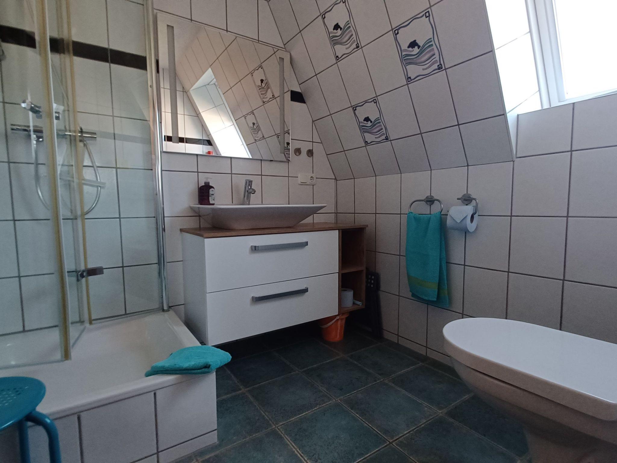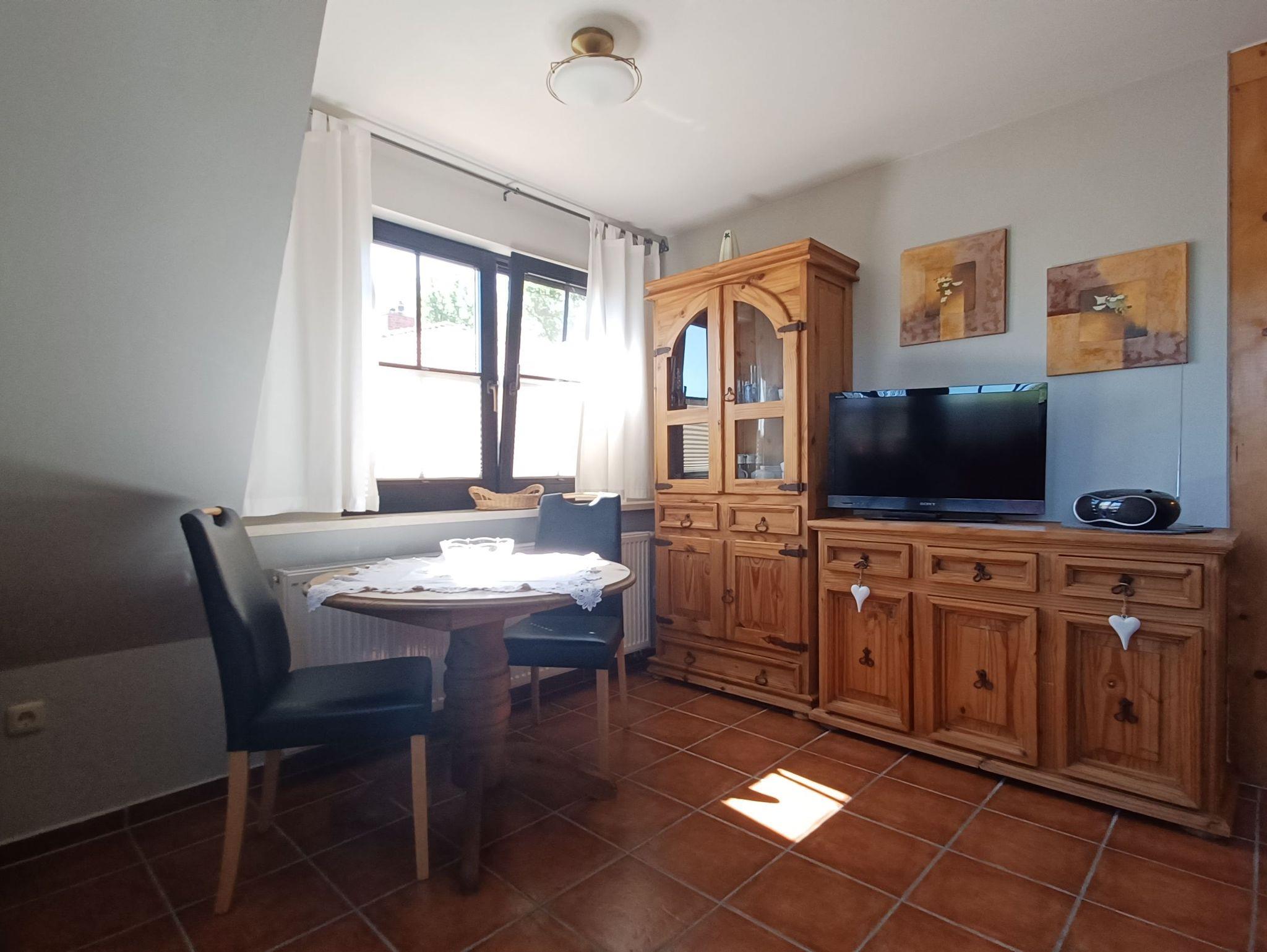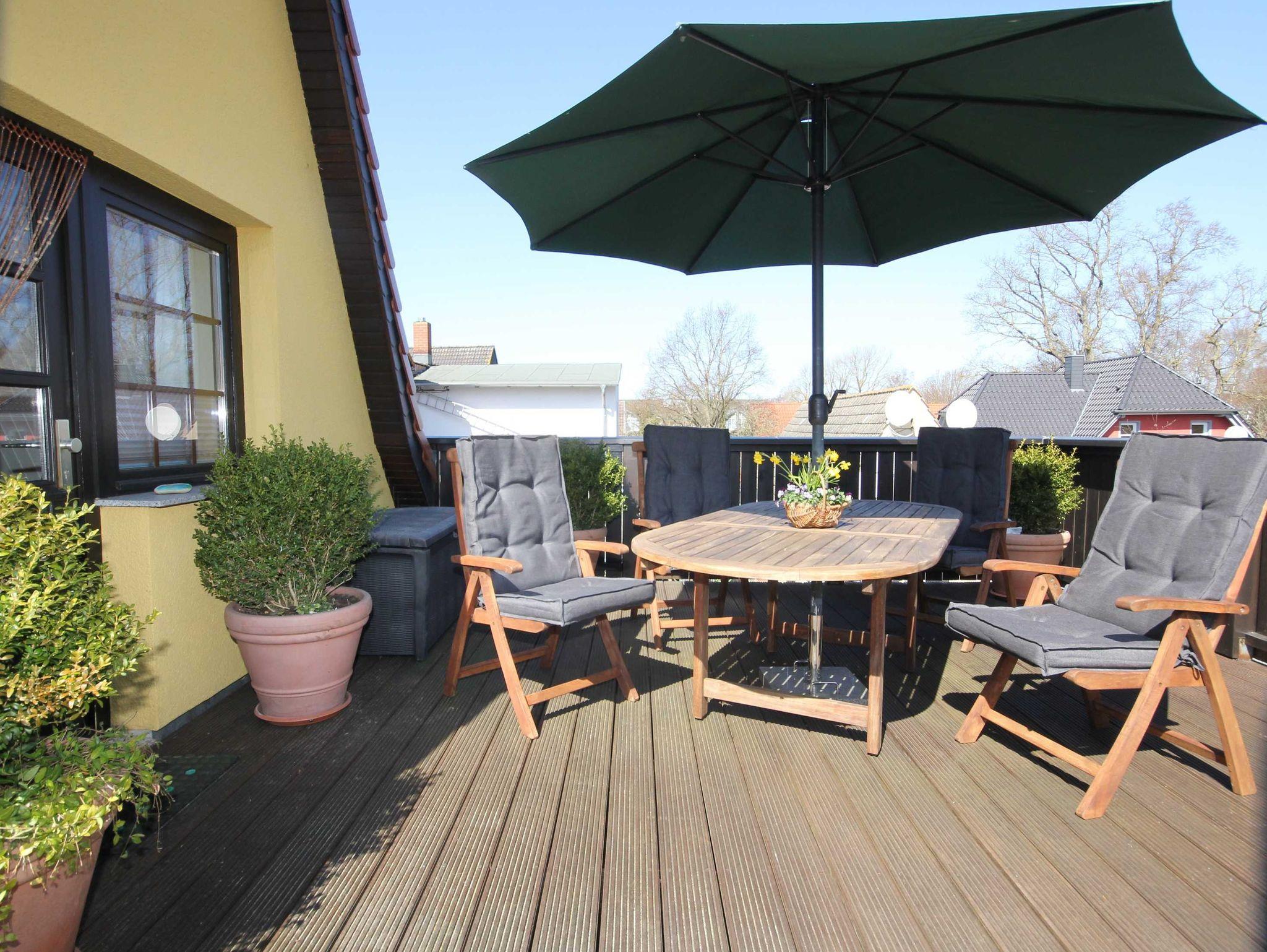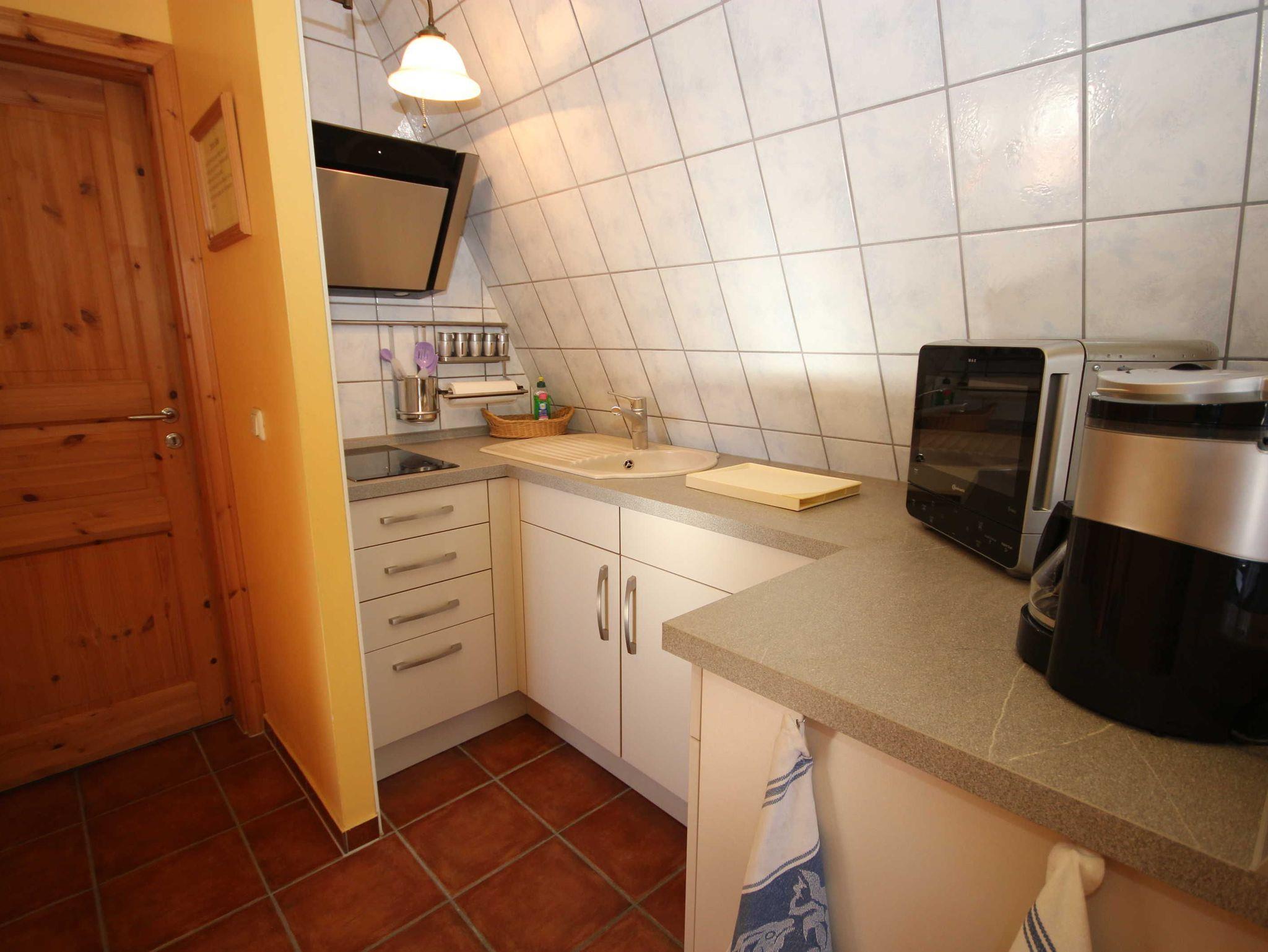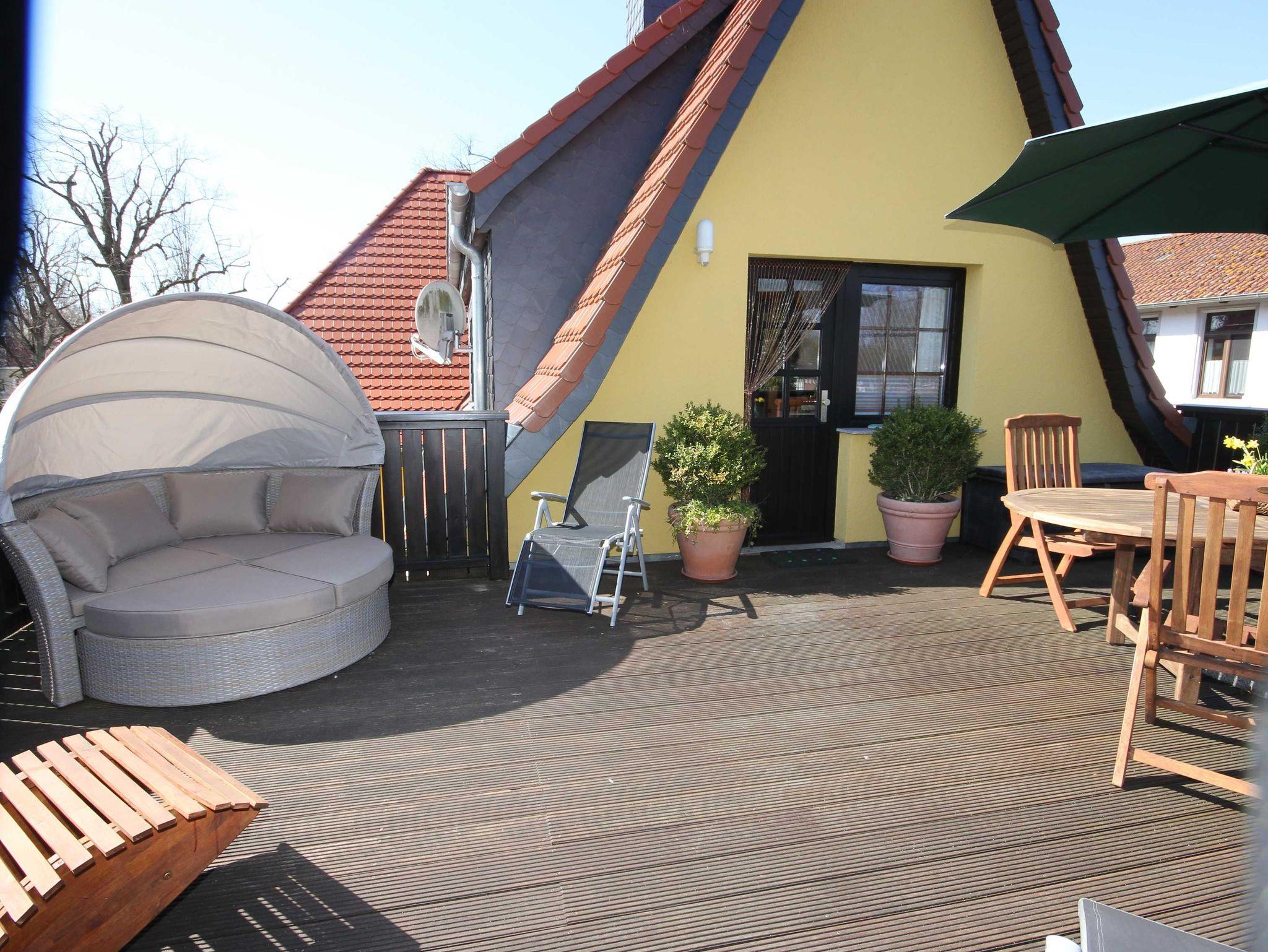 die komfortable Ferienwohnung mit liebevoller Ausstattung zum Detail und separatem Eingang über eine Freitreppe erreichbar, liegt im Obergeschoss. Genießen Sie die Nord- Ostseitige große Dachterrasse mit Gartenmöbel, einer Liegeinsel und Sonnenliegen, beim Frühstück oder lassen Sie den Abend mit einem guten Glas Wein am Strand in 250 m Entfernung ausklingen.Das Wohnzimmer verfügt über eine gemütliche Couch, kostenlosen WLAN- Gastzugang und SAT-TV. An das Wohnzimmer schließt sich die offene Küchenzeile an und ist ausgestattet mit einer Kühlschrank, und 2- Platten Cerankochfeld . Das separate Schlafzimmer verfügt über ein Doppelbett 1,80 x 2,00 m (getrennte Matratzen) und einem Kleiderschrank mit viel Stauraum.In der Ferienwohnung ist die Bettwäsche nicht vorhanden, die Handtücher können in der Zimmervermittlung für 7,00 € pro Person (1 Badetuch, 1 Handtuch) dazugebucht werden. Das Bad verfügt über eine Dusche/WC Für unsere Gäste sind die Fahrräder inclusive . Unsere Wohnungen sind Nichtraucherwohnungen. Die Kaution beträgt 100,- € und wird nach Abreise zurücküberwiesen.