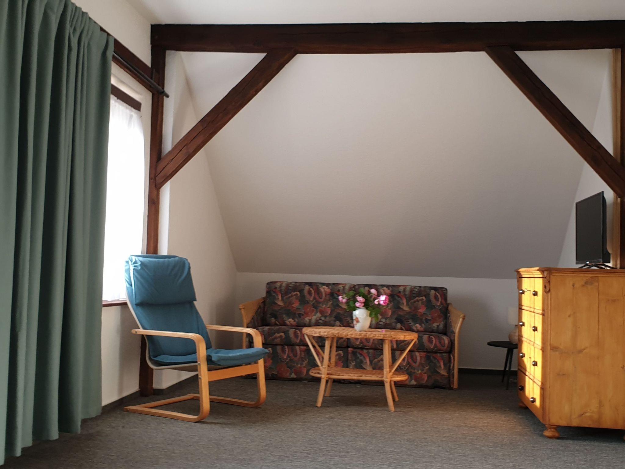 1 Doppelbett 140 x 200 cm (abgetrennter Bereich), 1 Schlafsofa 140 x 200 cm