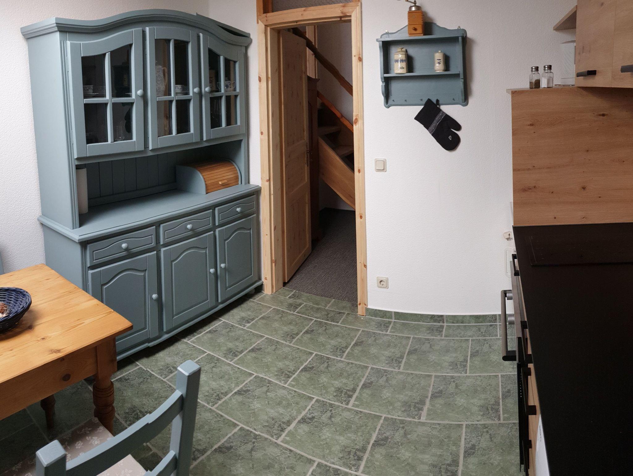 Herd mit Backofen, Spülmaschine, Kaffeemaschine, Wasserkocher, Kühlschrank, Mikrowelle, Sitzgruppe; voll ausgestattet mit Geschirr und Kochutensilien