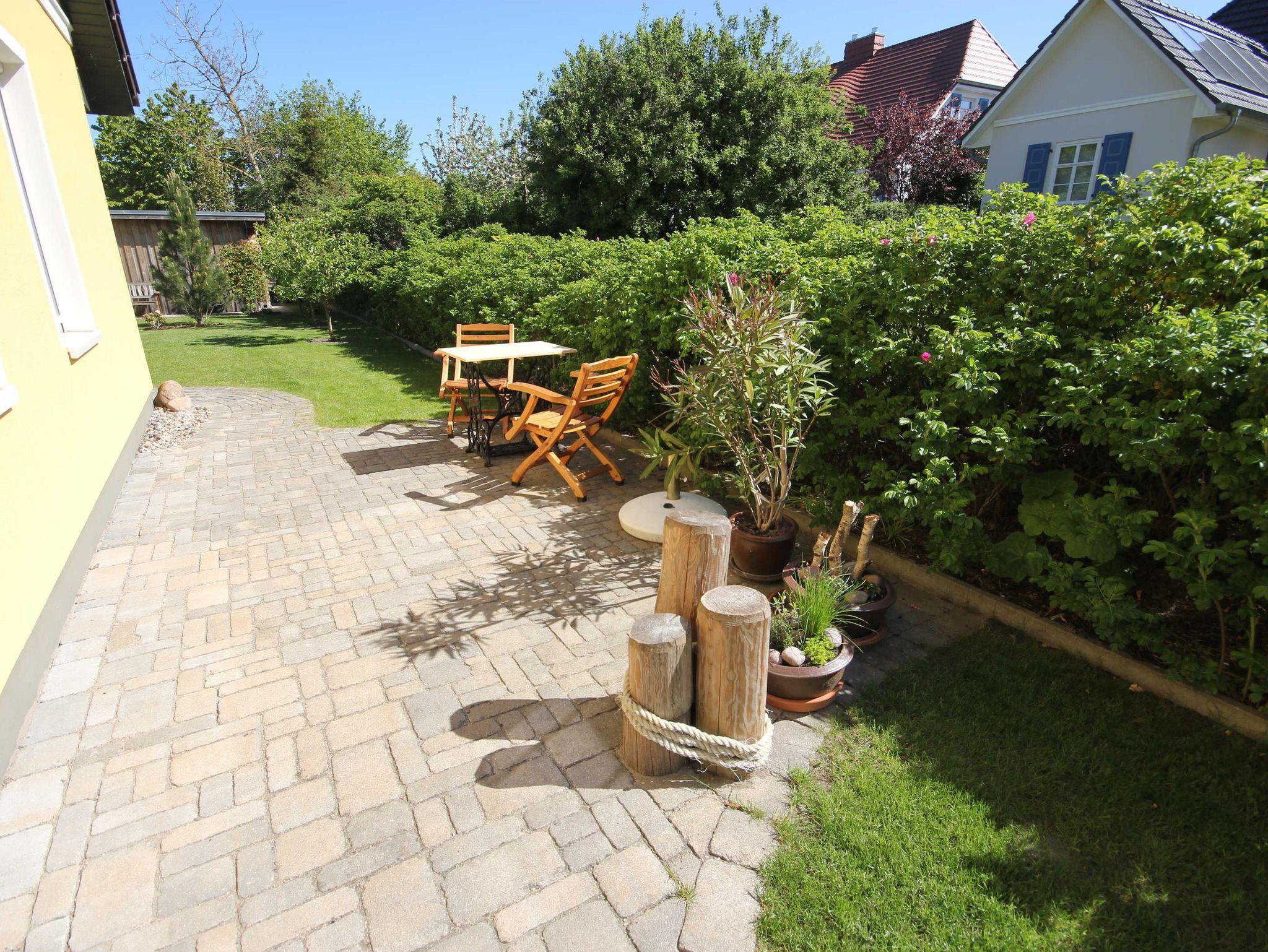 Ein Sitzplatz mit östlicher Ausrichtung befindet sich auf der Terrasse vor der Wohnung , ein zweiter mit westlicher Ausrichtung im Hausgarten.Für Fahrräder ist ein abschließbarer Schuppen mit E- Bike Ladestation vorhanden.