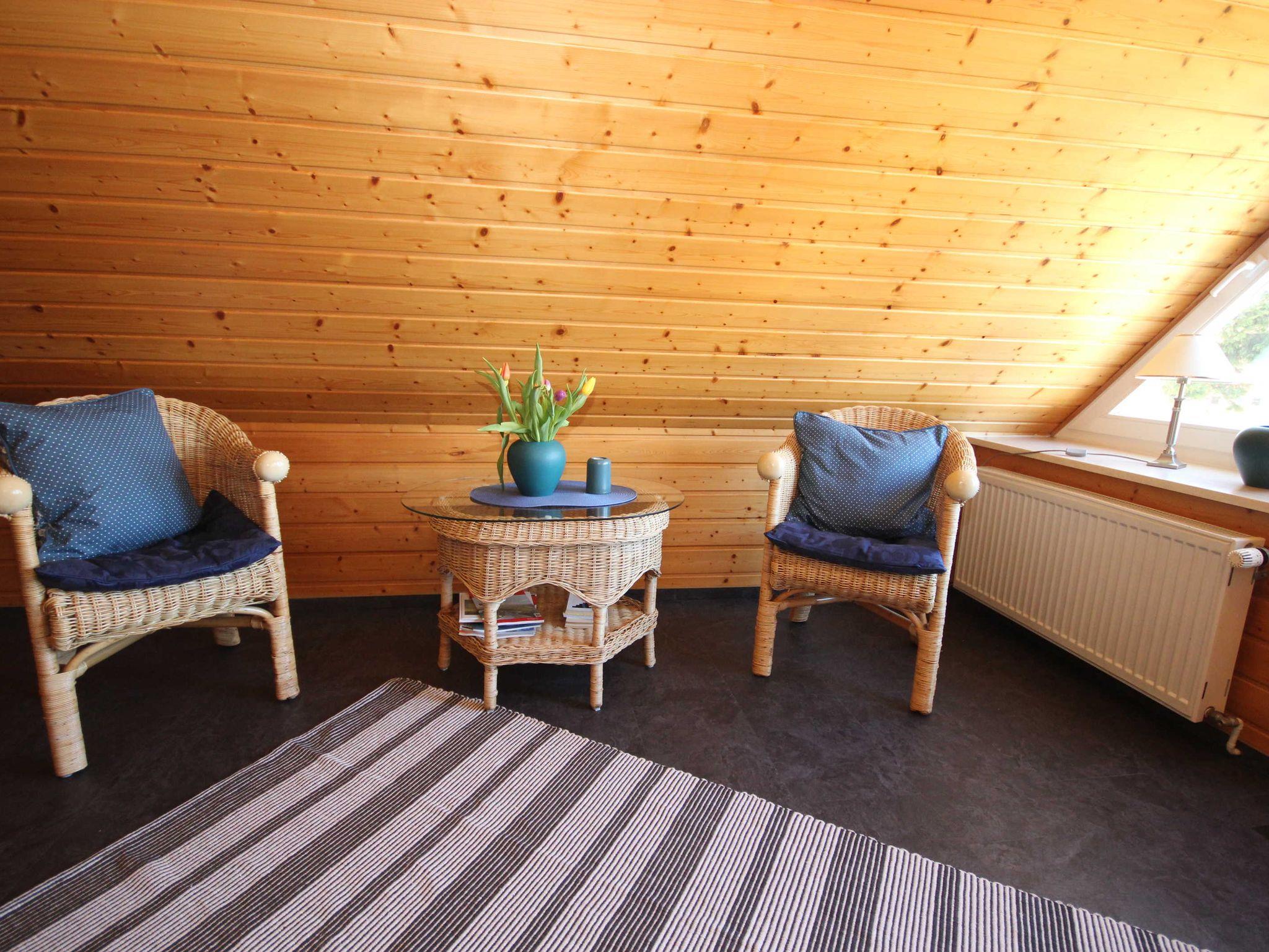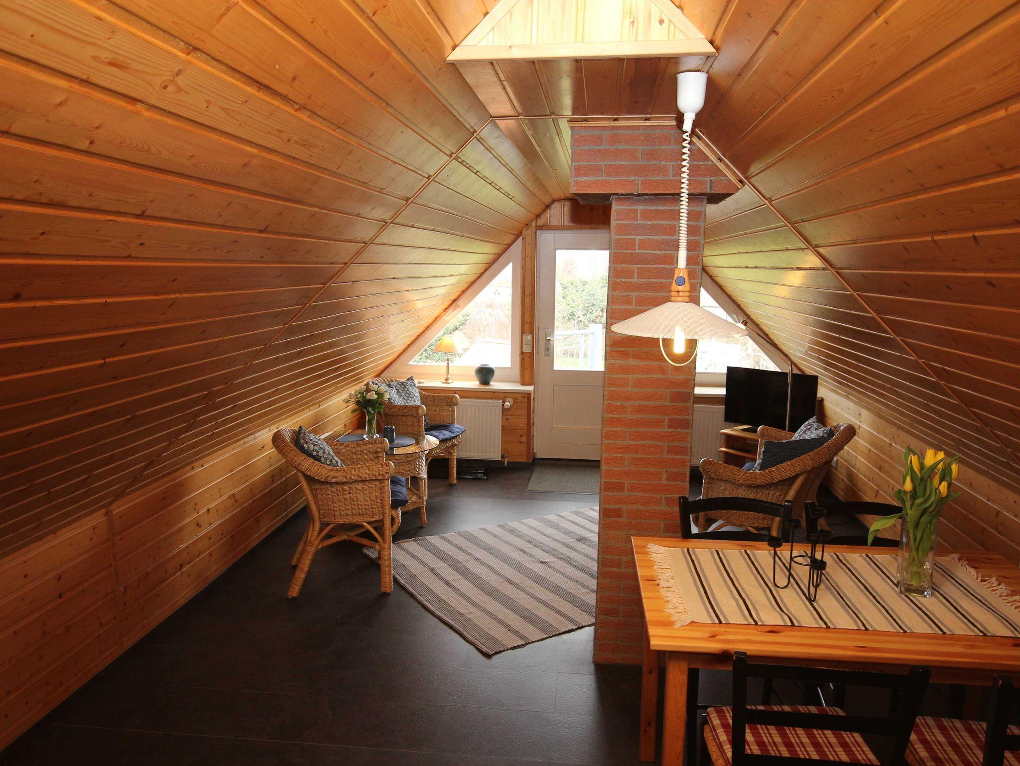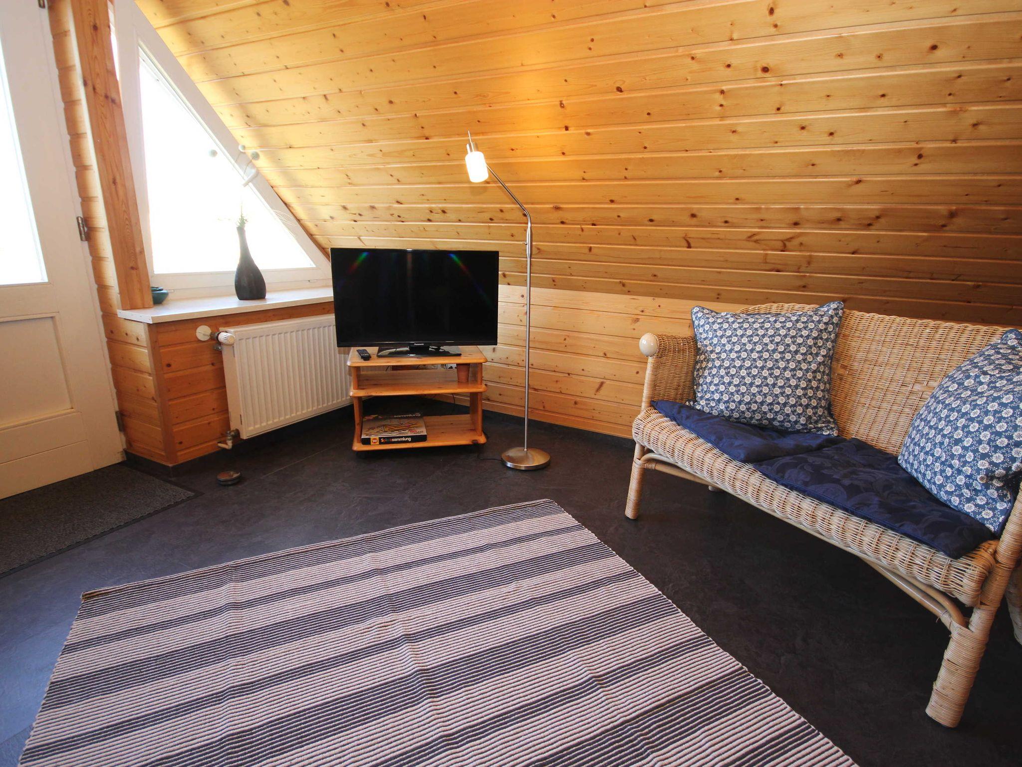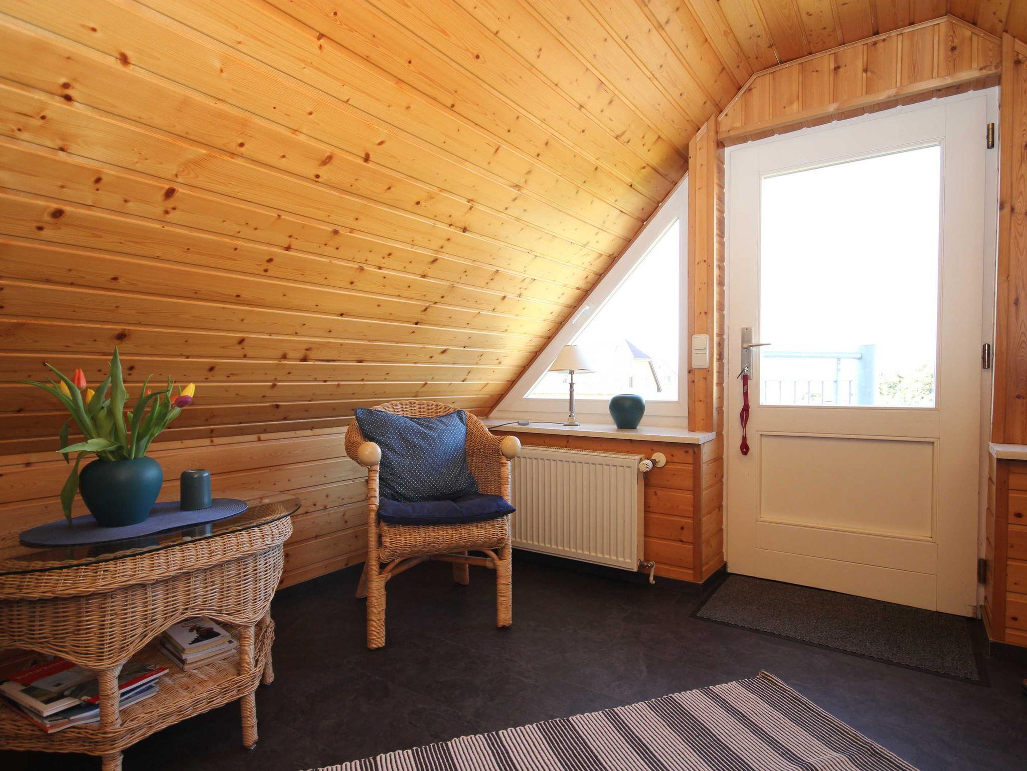 die Ferienwohnung im Obergeschoss mit separatem Eingang, in ruhiger Lage am Ortsrand ist über eine Aussentreppe erreichbar. Der Sitzplatz im Garten auf der separaten Terrasse lädt Sie zum verweilen und entspannen ein. An das offene Wohnzimmer mit kostenlosen WLAN- Gästezugang und SAT-TV, schließt sich die kleine Küchenzeile mit Essplatz an. Die Ferienwohnung verfügt über 2 - 1.Schlafzimmer mit Doppelbett 1,80 x 2,00 m (getrennte Matratzen) und das 2. Schlafzimmer ist über eine Raumspartreppe zur Schlafgalerie mit 2 Einzelbetten erreichbar 0,90 x 2,00 m. Die Wohnung wird inclusive Bettwäsche übergeben, Handtücher können in der Zimmervermittlung für 7,00 € pro Person (1 Badetuch, 1 Handtuch) dazugebucht werden. Das Rauchen in der Wohnung ist nicht gestattet. In der abgeschlossenen Garage ist Platz für 1 PKW. Der Strand ist in ca. 15 Gehminuten zu erreichen.